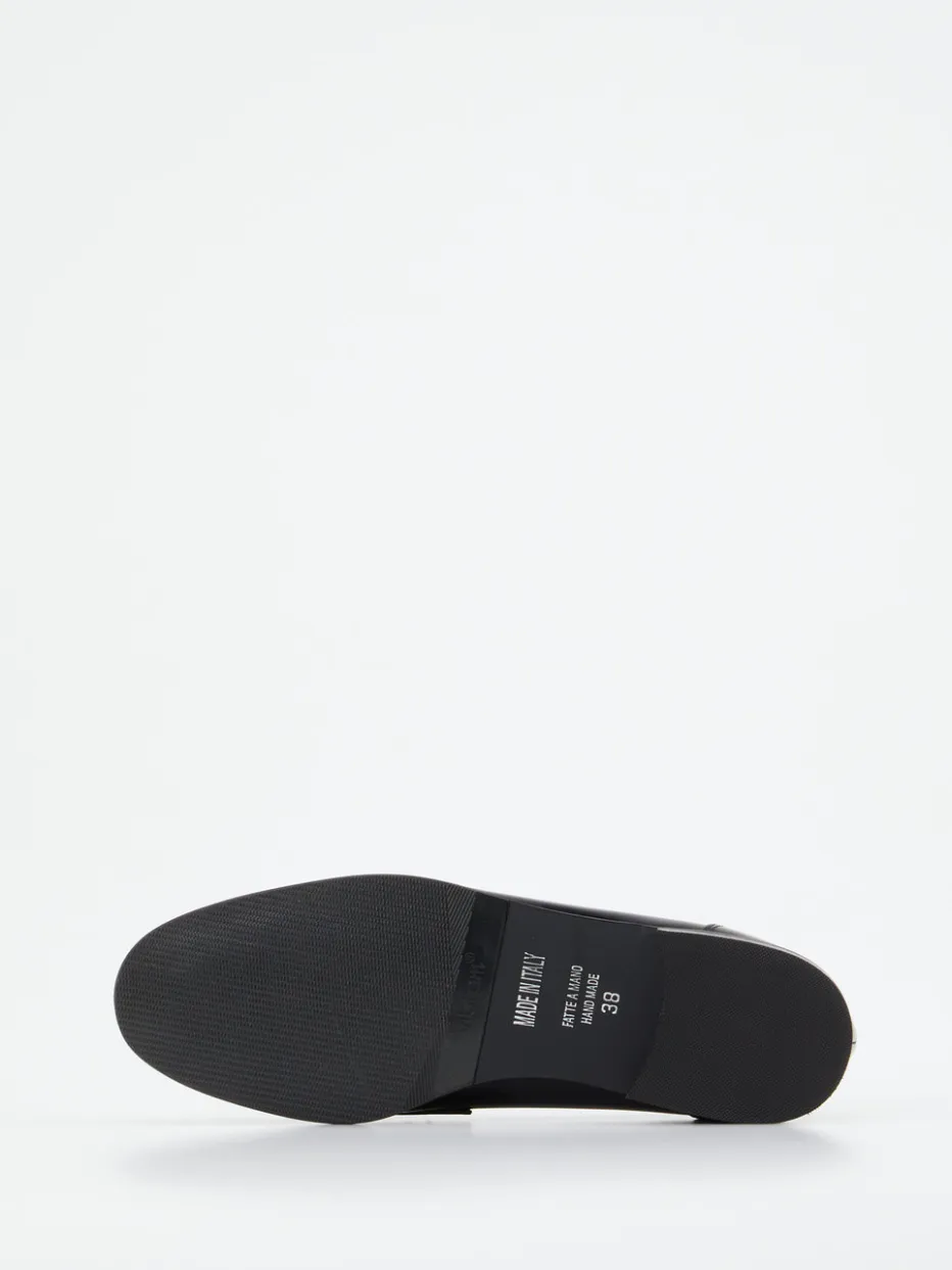 Glänzendes Hochglanzleder trifft klassische Formensprache auf zeitgemäße Weise. Der Loafer überzeugt durch edlen Minimalismus und dezente Metallic-Akzente.