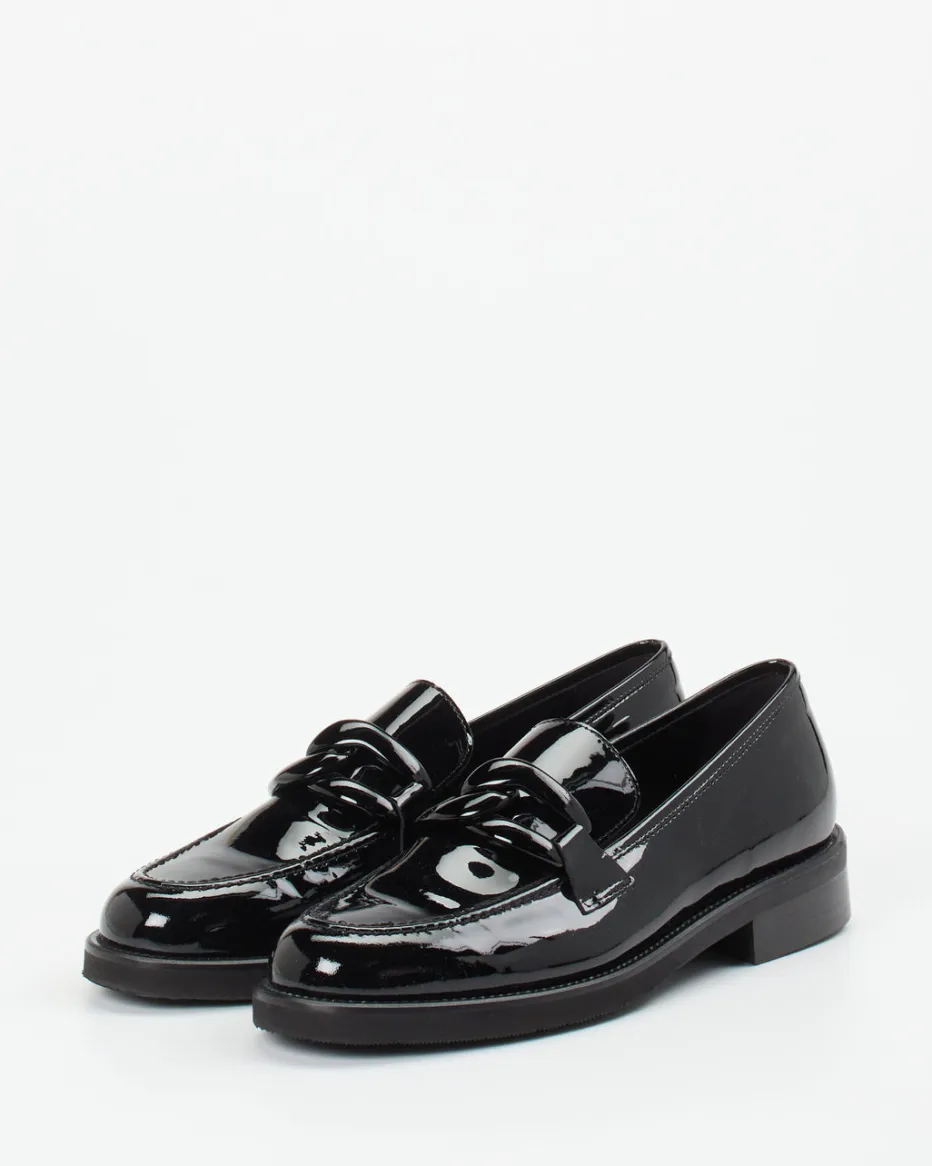 Modisch raffinierter Loafer mit glänzender Kette und edlem Lackleder – ideal für stilbewusste Business-Looks mit zeitgemäßem Twist.