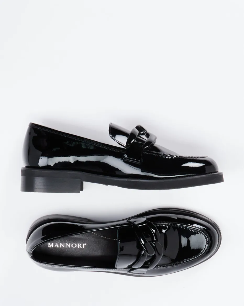Glanzstück im Stil der Saison.Der Damen-Loafer von Mannori kombiniert klassische Linienführung mit trendigem Hochglanz. Für formelle Anlässe oder stilvolle Alltagsmomente eignet sich dieses Modell durch das schwarze, glänzende Lackleder sowie die strukturgebende Zierkette in Ton-in-Ton-Optik. Der flache Blockabsatz mit Holzoptik und das weiche Lammnappafutter sorgen für angenehmen Tragekomfort, während die profilierte Gummisohle stabilen Halt bietet. Minimalistische Silhouette und subtile Retro-Elemente machen dieses Modell zum Verfechter des „Quiet Luxury“-Trends. Besonders harmonisch zu Stoffhose oder Lederhandtasche. Komfort, Glanz und Design in perfekter Balance – charakteristisch für Mannori.