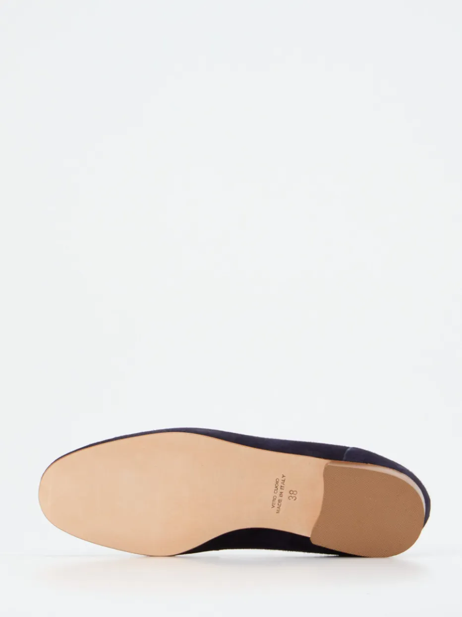 Ob im Büro oder beim Stadtbummel – dieser Slipper aus dunkelblauem Veloursleder mit samtig-matter Oberfläche bietet angenehmen Tragekomfort. Die goldfarbene Zierschnalle setzt einen femininen Akzent, tonige Nähte unterstreichen seine ruhige Linienführung. Der flache Blockabsatz und die hochwertige Ledersohle ergänzen die klassisch-flache Silhouette. Inspiriert vom Preppy-Stil und dem ‚Quiet Luxury‘-Trend, lässt sich der Loafer ideal zu Blazern und Lederaccessoires kombinieren.