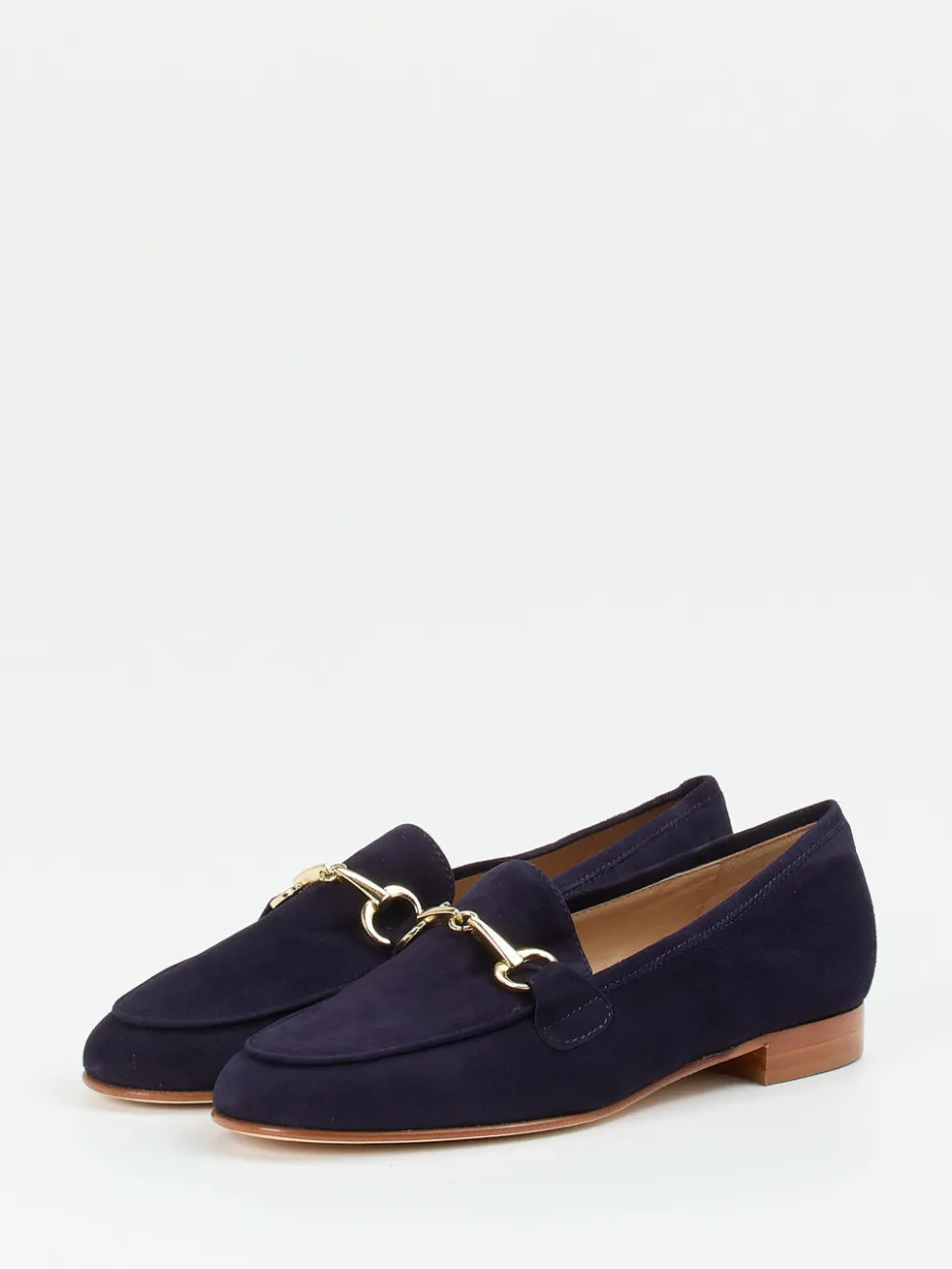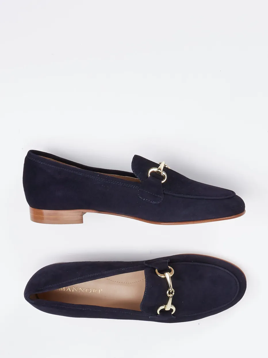 Der Loafer von Mannori überzeugt mit samtigem Veloursleder in Dunkelblau und einer eleganten goldfarbenen Spange – ein idealer Begleiter für stilvolle Office-Looks mit subtilem Luxusanspruch.