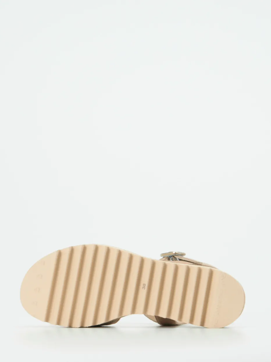 Sommerlicher Chic mit Metallic-Flair.Die Damen-Plateausandale von Mannori überzeugt durch femininen Minimalismus und moderne Leichtigkeit. Ideal für Urlaub oder City-Spaziergänge bei sommerlichen Temperaturen: Das beigefarbene Veloursleder mit samtiger Haptik trifft auf goldfarbene Metallic-Details und eine markante, gezackte Gummisohle. Breite Kreuzriemen, ein verstellbarer Fersenriemen und die leichte Plateausohle sorgen für angenehmen Tragekomfort. Der goldene Sohlenrahmen unterstreicht den dezenten Glamour und greift zugleich aktuelle Trendakzente auf. Besonders harmonisch wirkt der Look zu Naturtönen. Stil, Komfort und Trendsicherheit – fein vereint im Design von Mannori.