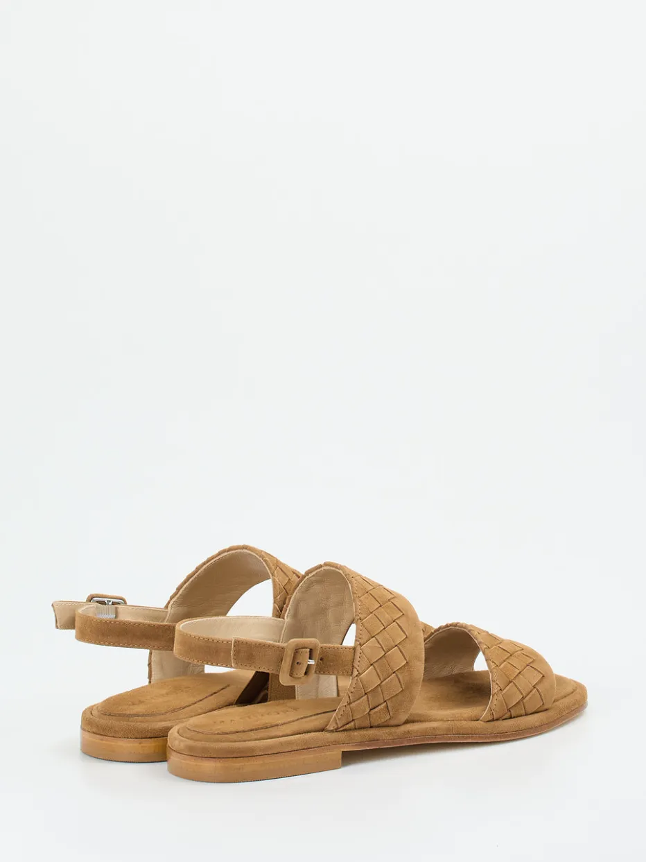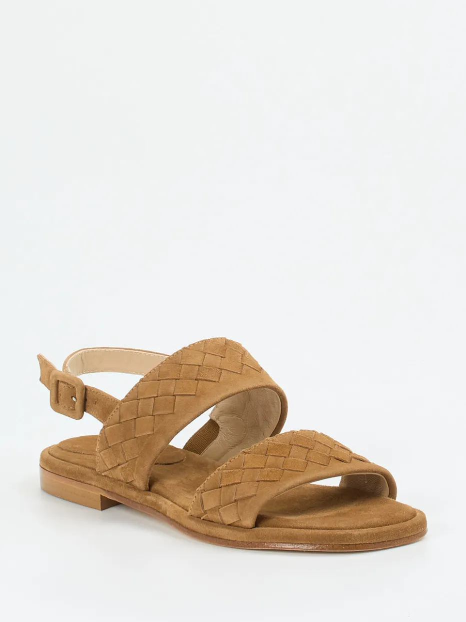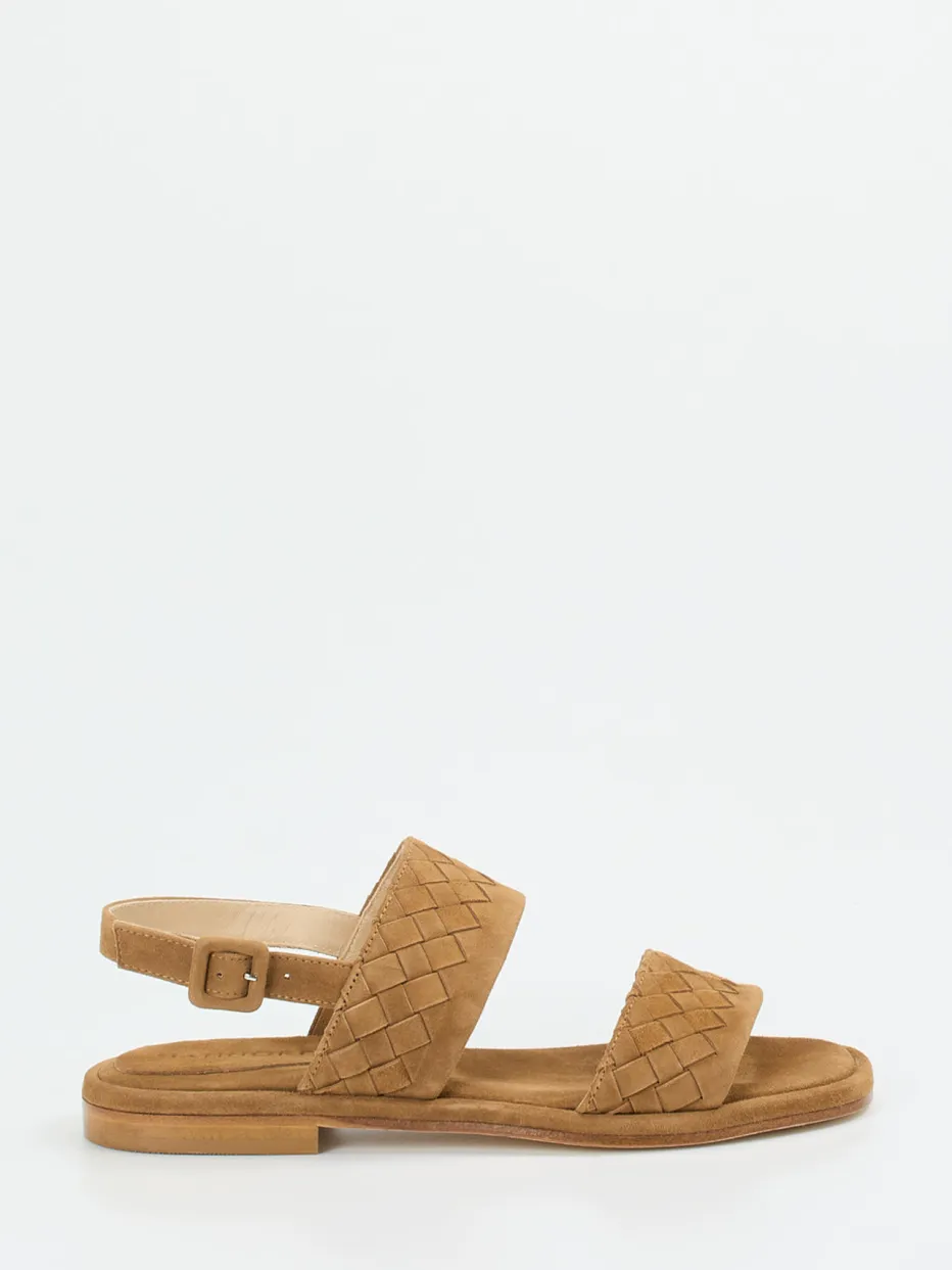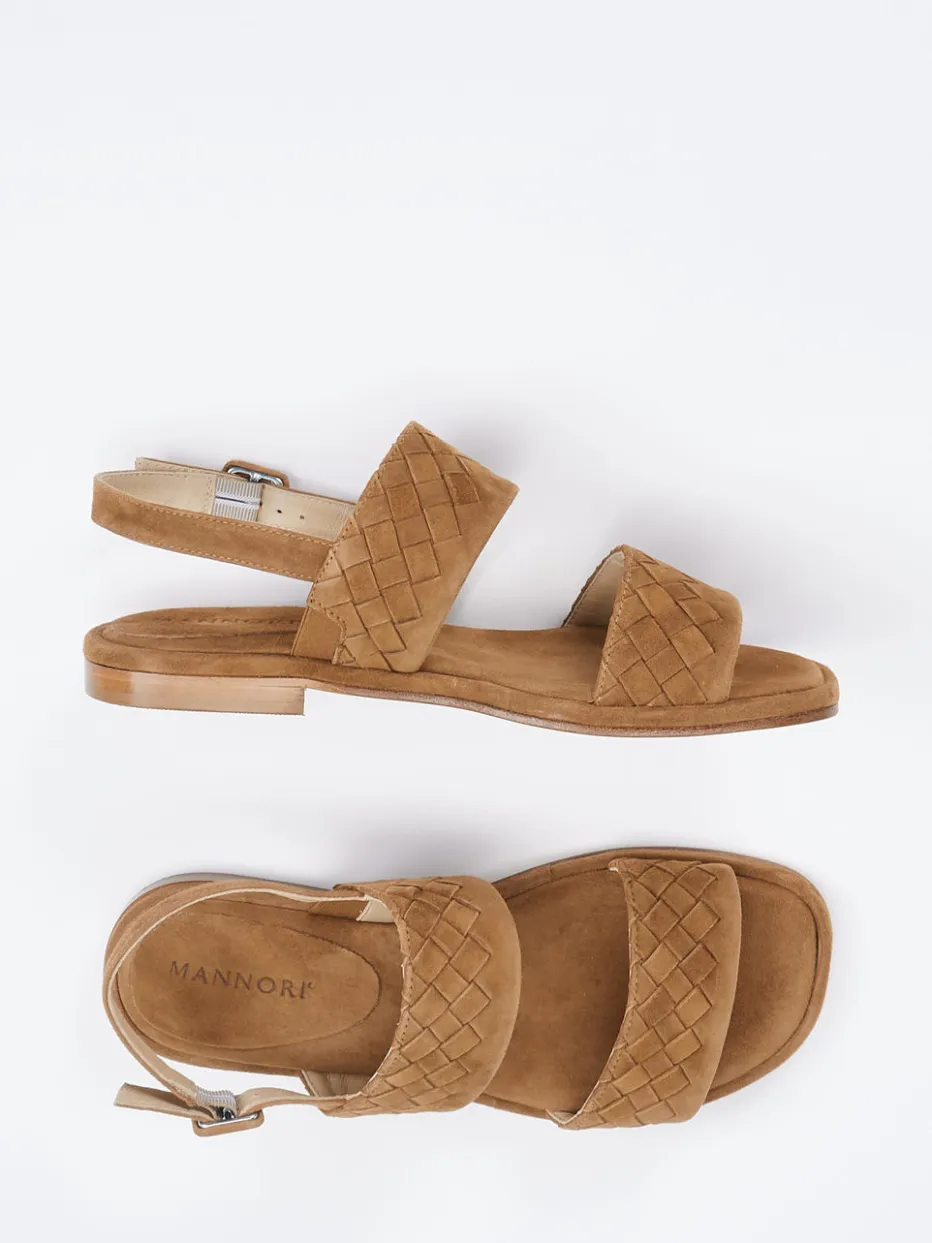 Flechtstruktur mit mediterranem Flair.Mannori präsentiert eine Damen-Sandale, die sommerliche Leichtigkeit und italienische Raffinesse vereint. Ob beim Stadtspaziergang oder auf Reisen – das cognacfarbene Veloursleder (samtig angeschliffen) bietet mit gepolstertem Fußbett und verstellbarem Fersenriemen hohen Komfort. Die flache, offene Silhouette mit leicht eckiger Zehenpartie betont die handwerkliche Flechtstruktur. Ton-in-Ton-Nähte und eine naturfarbene Ledersohle mit dezentem Absatz setzen hochwertige Akzente. Der Stil passt perfekt in die „Quiet Luxury“-Tendenz und ergänzt entspannte, minimalistische Outfits. Ein authentischer Look mit Gefühl für Komfort und Reduktion.