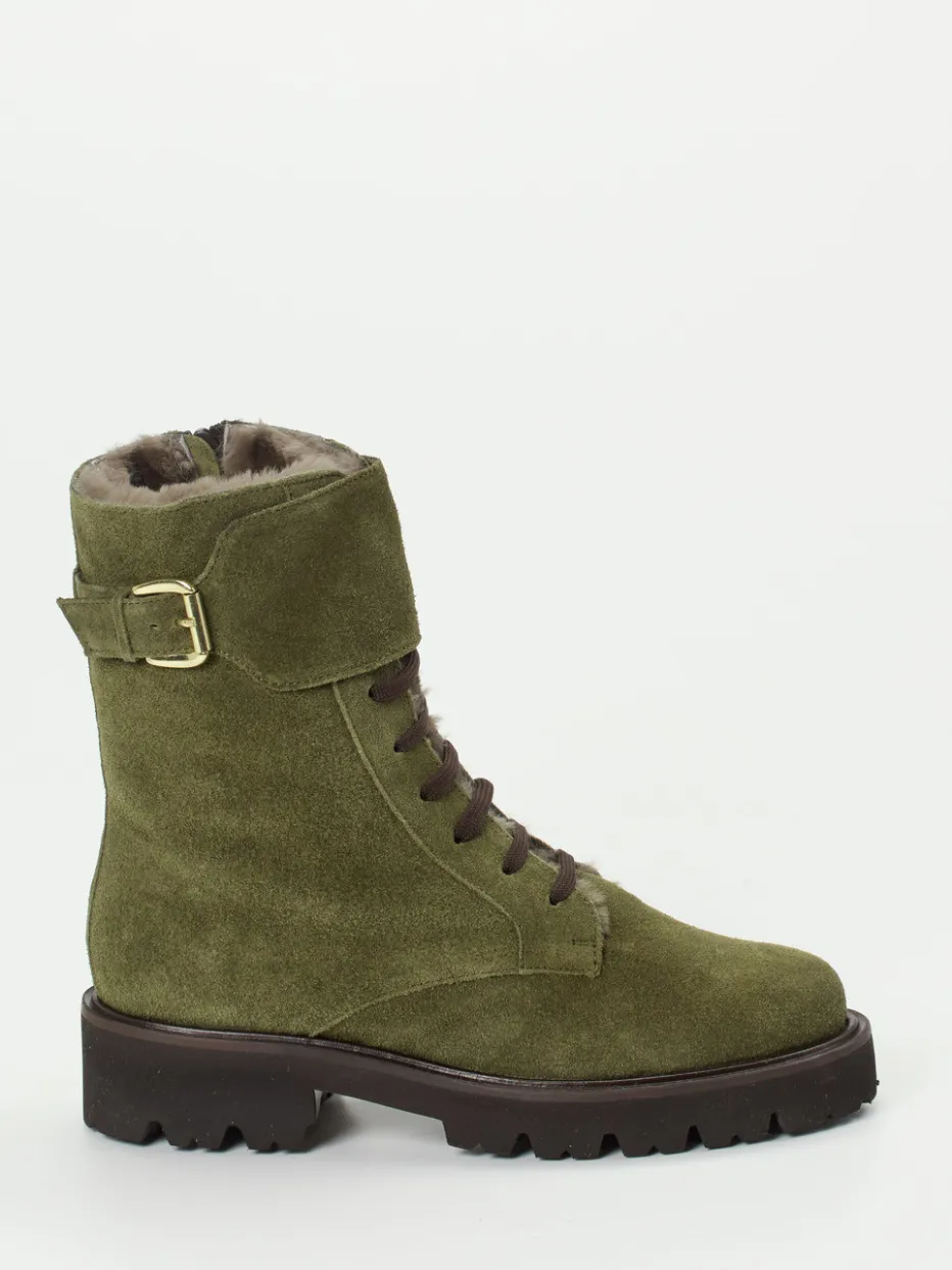 Diese gefütterte Schnürstiefelette kombiniert alpines Design mit wertigem Veloursleder in Olivgrün. Lammfellfutter und rutschfeste Sohle sichern Komfort und Wettertauglichkeit.