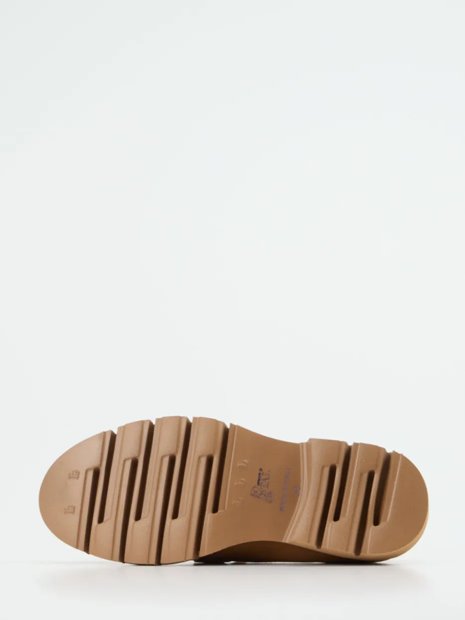 Die Mischung aus cognacfarbenem Veloursleder, tonaler Zierkette und breiter Profilsohle bringt Streetwear-Flair in einen eleganten Klassiker.