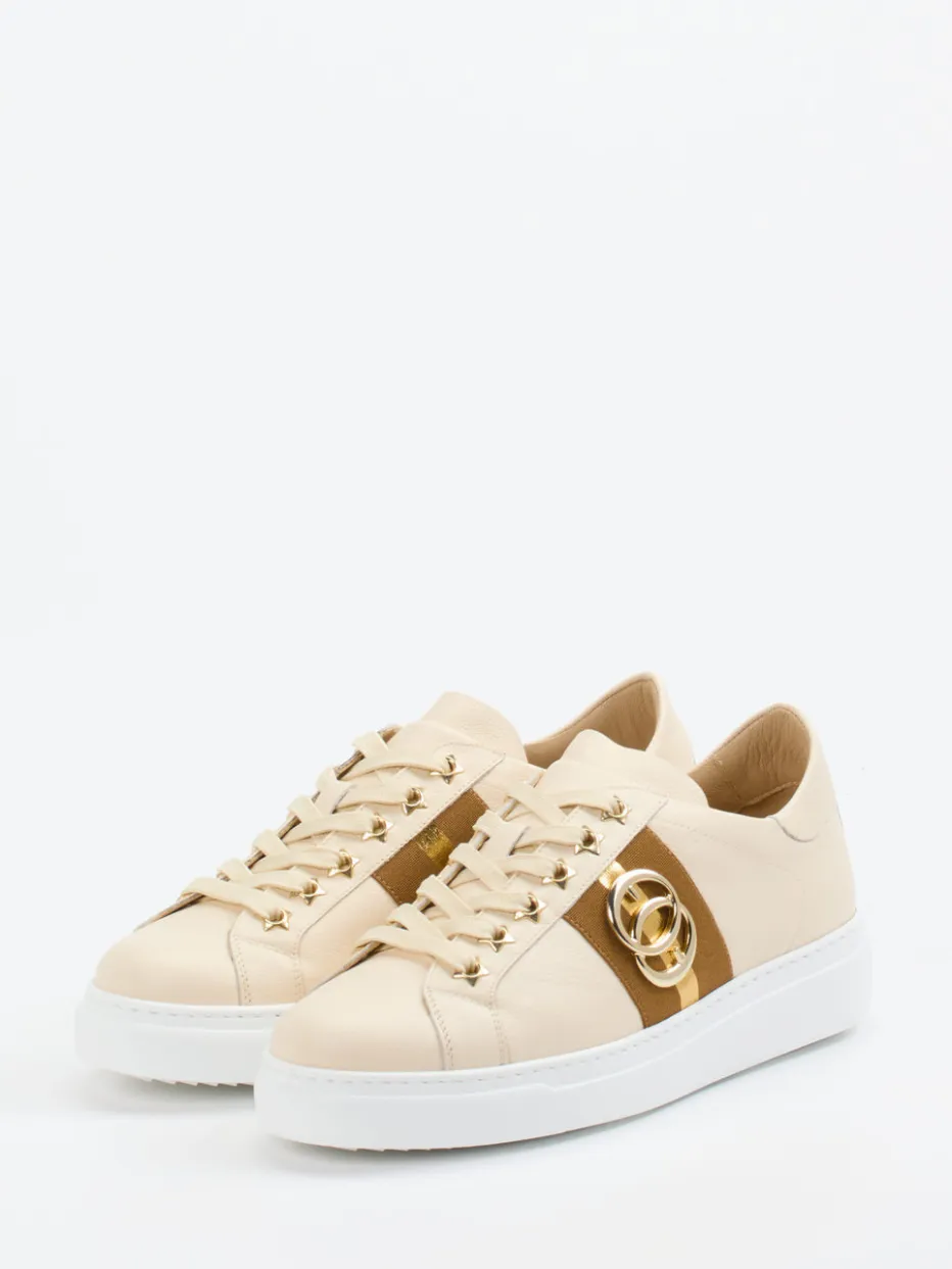 Ob beim Citybummel oder auf Reisen – der cremebeige Sneaker verbindet Komfort mit luxuriösem Design. Gefertigt aus hochwertigem Kalbleder mit genarbter Oberfläche, zeigen sich an den Seiten schokoladenbraune und goldmetallicfarbene Applikationen, begleitet von goldfarbenen Ösen und einem dezenten Logo. Die klassisch-runde Silhouette wird durch eine weiße Gummisohle mit leichtem Plateau betont. Trendige Metallic-Akzente lassen sich ideal mit soften Neutral-Tönen kombinieren und passen in urbane Casual-Styles.
