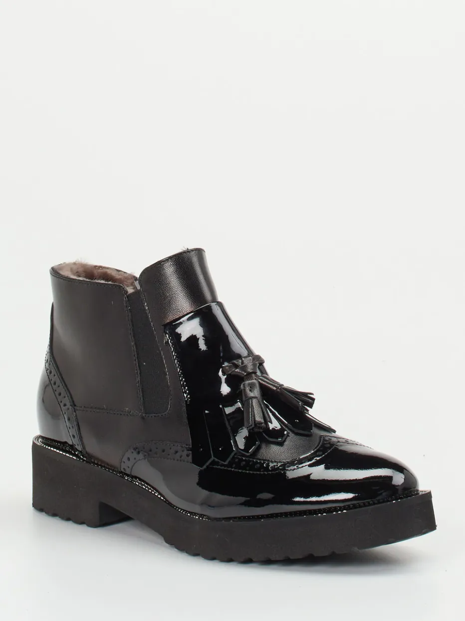 Diese elegante Stiefelette verbindet glänzendes Lackleder mit klassischem Broguing und modernem Tassel-Design – ein stilvoller Begleiter für Wintertage in Büro und Alltag.