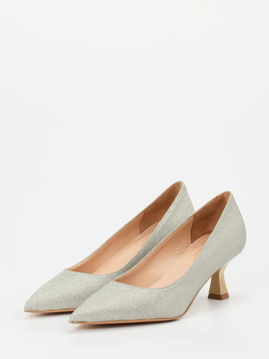 Ob Theaterbesuch oder Hochzeit: Das silberfarbene Textil mit glitzernder Oberfläche präsentiert sich mit spitz zulaufender Form und geschwungener Linie besonders edel. Ergänzt durch ein weiches Innenfutter aus Ziegenleder, sorgt das gepolsterte Fußbett für Komfort. Der bezogene Absatz in goldschimmernder Lackoptik verleiht dem Modell eine subtile Vintage-Note. Glanzdetails und reduzierte Formensprache harmonieren mit Trends wie „Quiet Luxury“ oder „Metallic Accents“. Ideal kombiniert mit Clutch und Seidenhose.