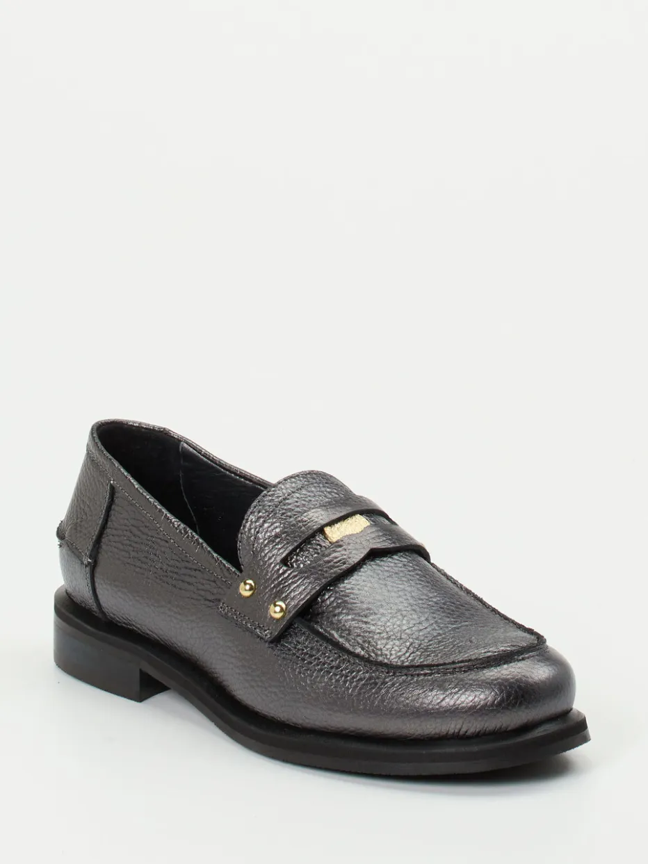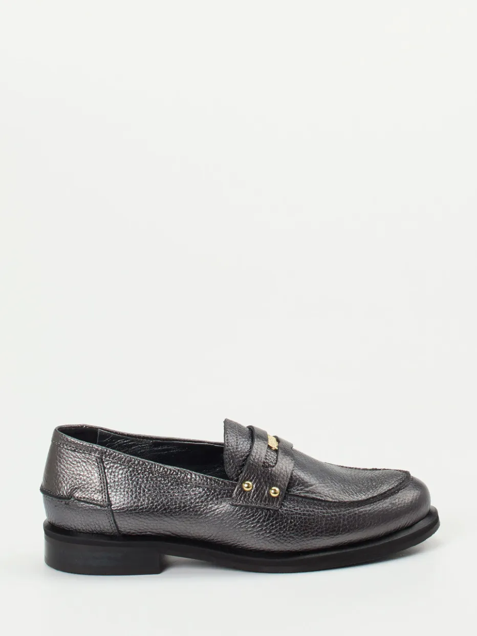 Für Tage, an denen Komfort und Stil gleichermaßen gefragt sind, bietet dieser Schuh mit seinem samtig genarbten Kalbleder in graphitgrauem Metallic-Finish eine ideale Lösung. Die flache Silhouette, ein flacher Blockabsatz und der Schlupfeinstieg betonen seine Alltagstauglichkeit. Den Retro-Charme eines Penny Loafers greift die geschlitzte Spange mit eingelegter Ziermünze gekonnt auf. Goldfarbene Metalldetails greifen den Metallic-Trend auf und verleihen dem Modell einen spannenden Twist. Harmoniert hervorragend mit schmalen Stoffhosen oder Blazern für ein stilvolles Büro-Outfit.