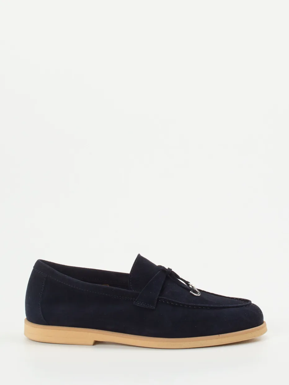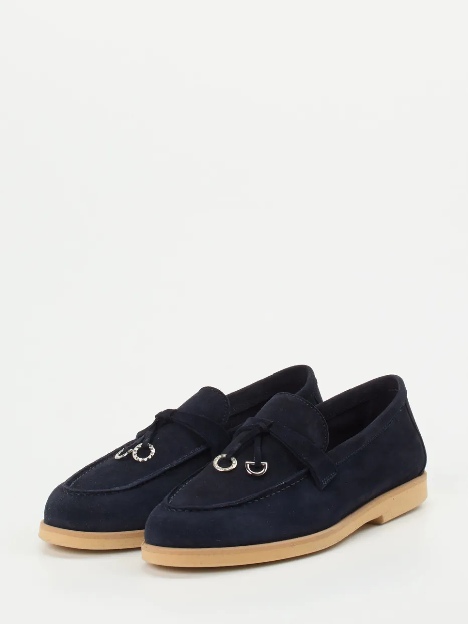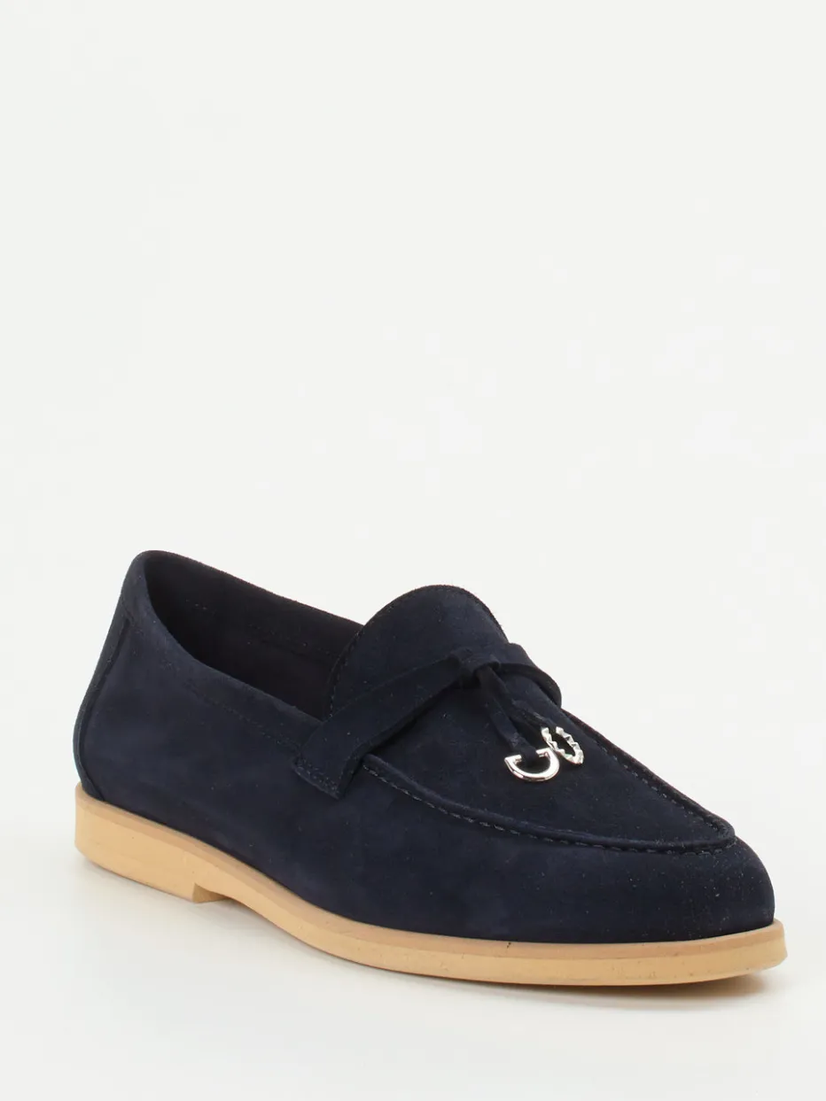 Italienischer Stil trifft auf modernen Minimalismus.Maripé präsentiert hier einen Damen-Loafer der klassischen Art. Für entspannte Tage im Büro, beim Stadtbummel oder in der Freizeit bietet der aus dunkelblauem Veloursleder gearbeitete Slipper angenehmen Tragekomfort. Die matte Oberfläche verleiht der Silhouette Eleganz, während silberfarbene Metallösen mit dekorativer Kordel das Design akzentuieren. Ungefüttert und mit flexibler Gummisohle ausgestattet, punktet das Modell auch an warmen Tagen durch überraschend hohe Bequemlichkeit. Der Look passt perfekt zu Chinohosen oder leichten Sommerkleidern und folgt dabei dem „Quiet Luxury“-Trend. Italienische Handwerkskunst für stilbewusste Alltagssituationen.