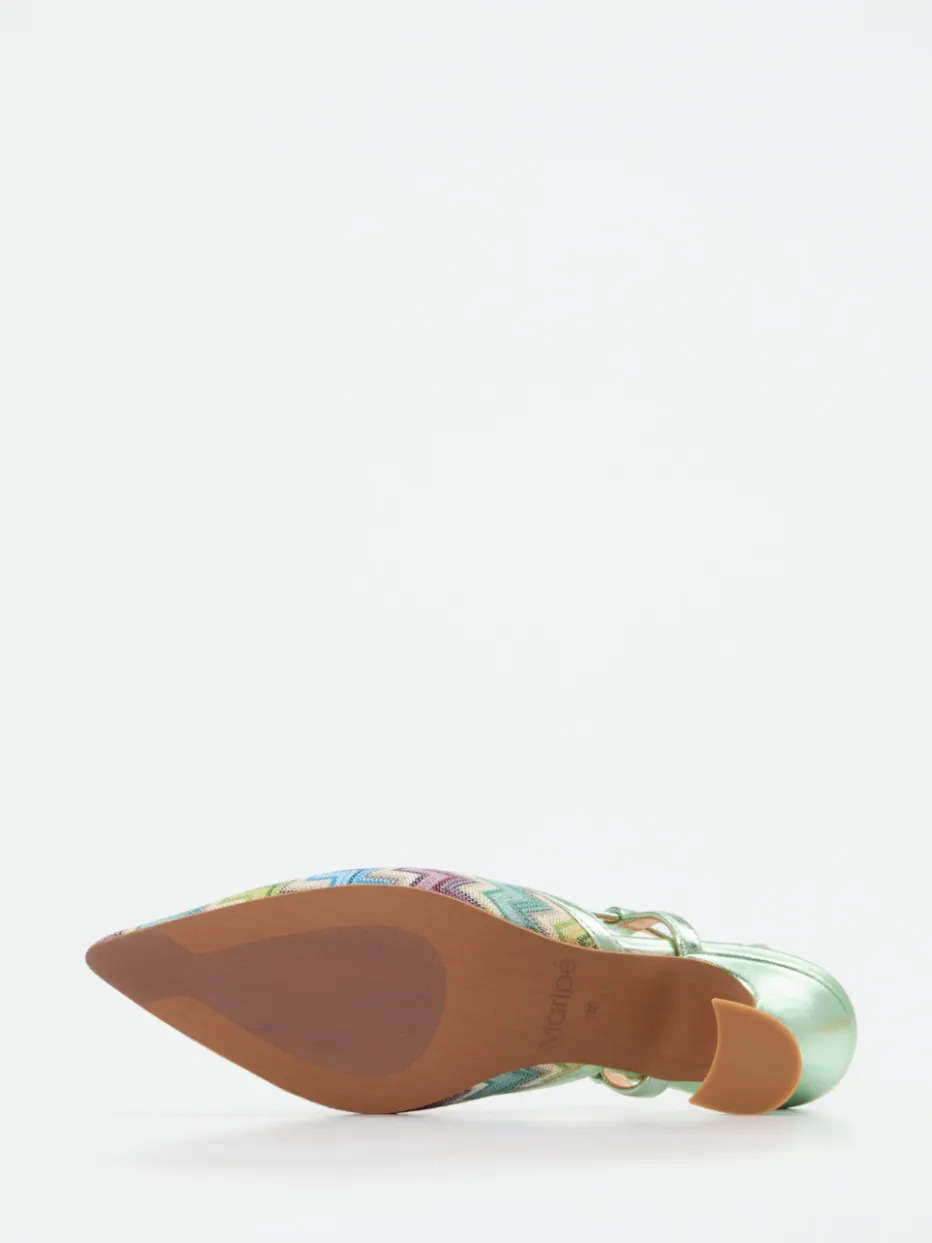Ein Eyecatcher für warme Nächte.Maripé präsentiert mit diesen Slingback-Pumps ein feminines Modell für festliche oder modisch ambitionierte Anlässe. Das mehrfarbige Textil in Mintgrün mit Zickzackstruktur trifft auf metallic-schimmernde Riemen und eine spitz zulaufende Front. Der verstellbare Fersenriemen mit goldfarbener Schließe sorgt für optimalen Halt, während der trichterförmige Absatz in Skulpturform und das weiche Lederfußbett Komfort und Stil vereinen. Ein Must-have für trendbewusste Looks zwischen Italo-Glam und 70er-Revival, perfekt kombiniert mit pastelligen Kleidern oder Metallic-Accessoires. Ein charakterstarkes Modell mit außergewöhnlicher Farbharmonie und hochwertigen Materialien.