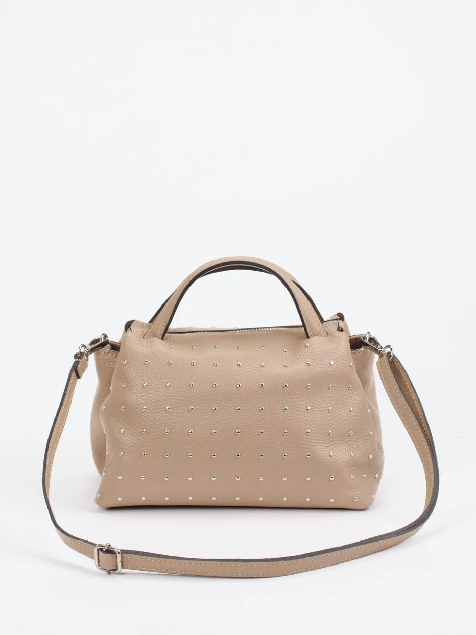 Die genarbte Kalbleder-Handtasche vereint minimalistisches Design mit markantem Studded-Look – ein stilvoller Akzent für elegante Alltagsmomente.