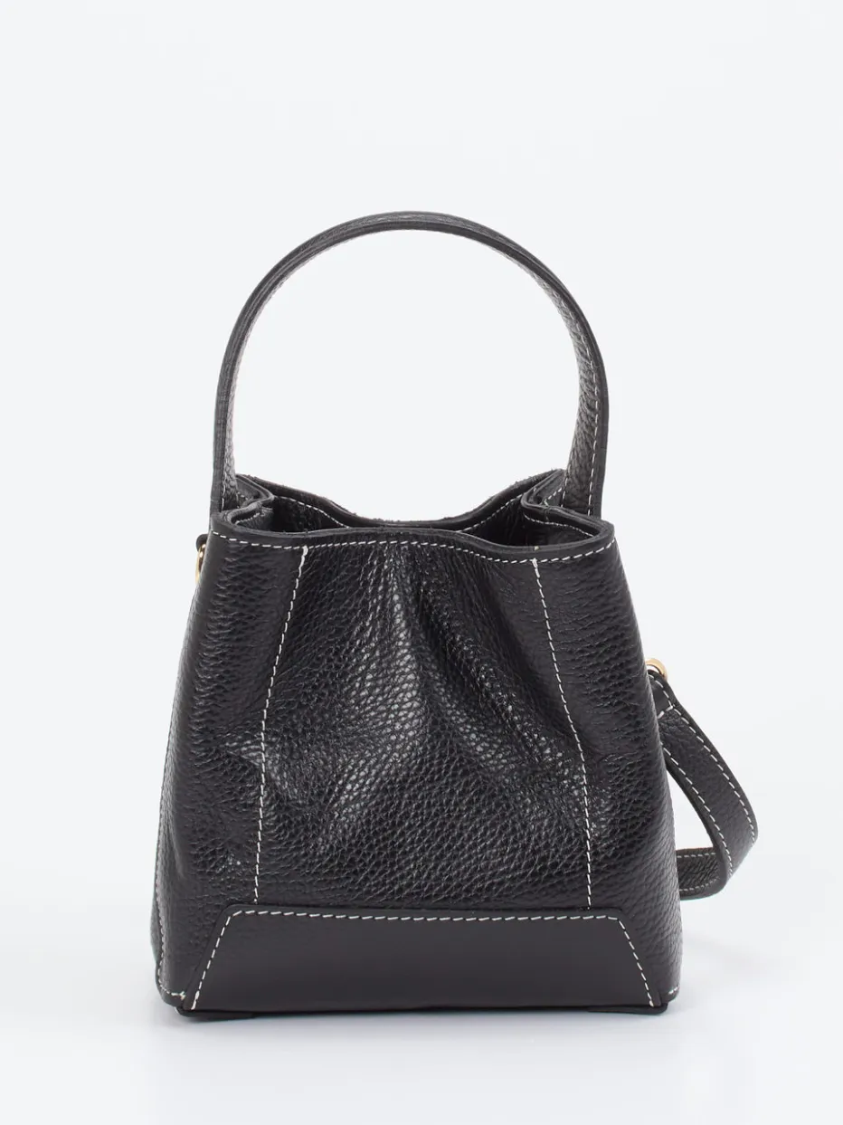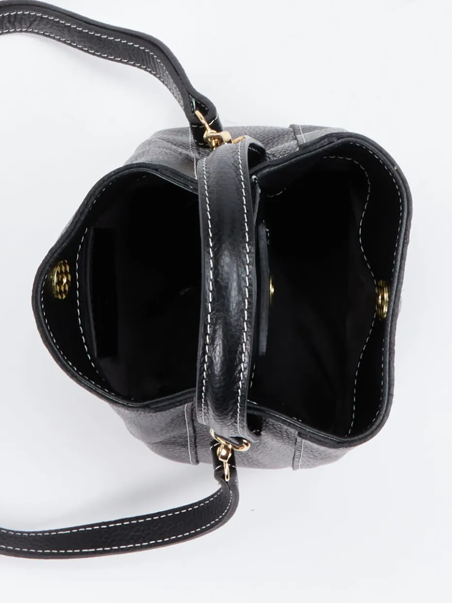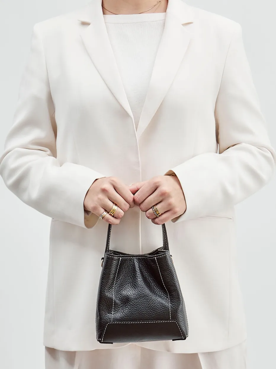 Die Mini-Bucket Bag von Marlon Firenze vereint hochwertiges Kalbleder mit goldfarbenen Akzenten und minimalistischem Design – perfekt für stilbewusste Looks zwischen Büro und Freizeit.
