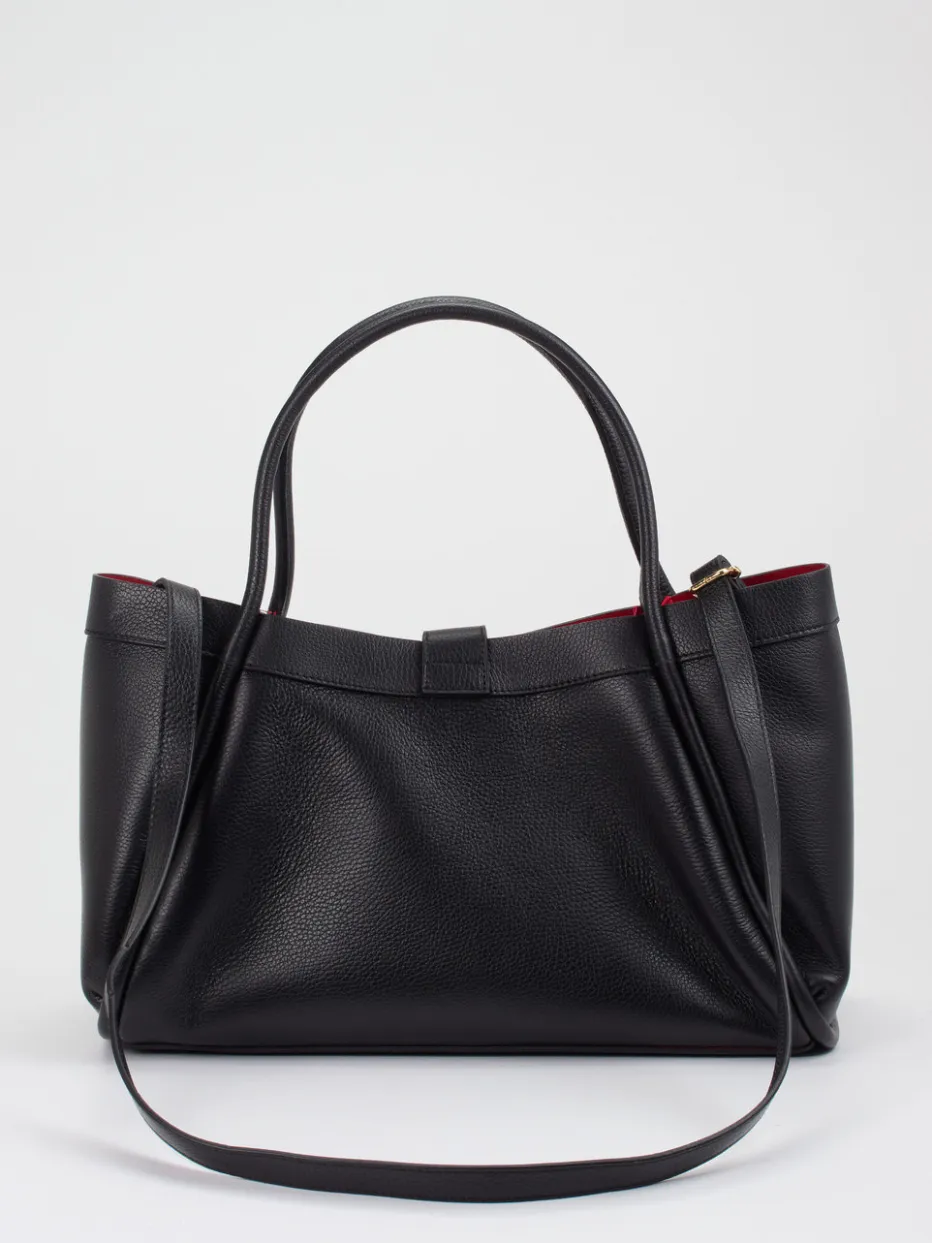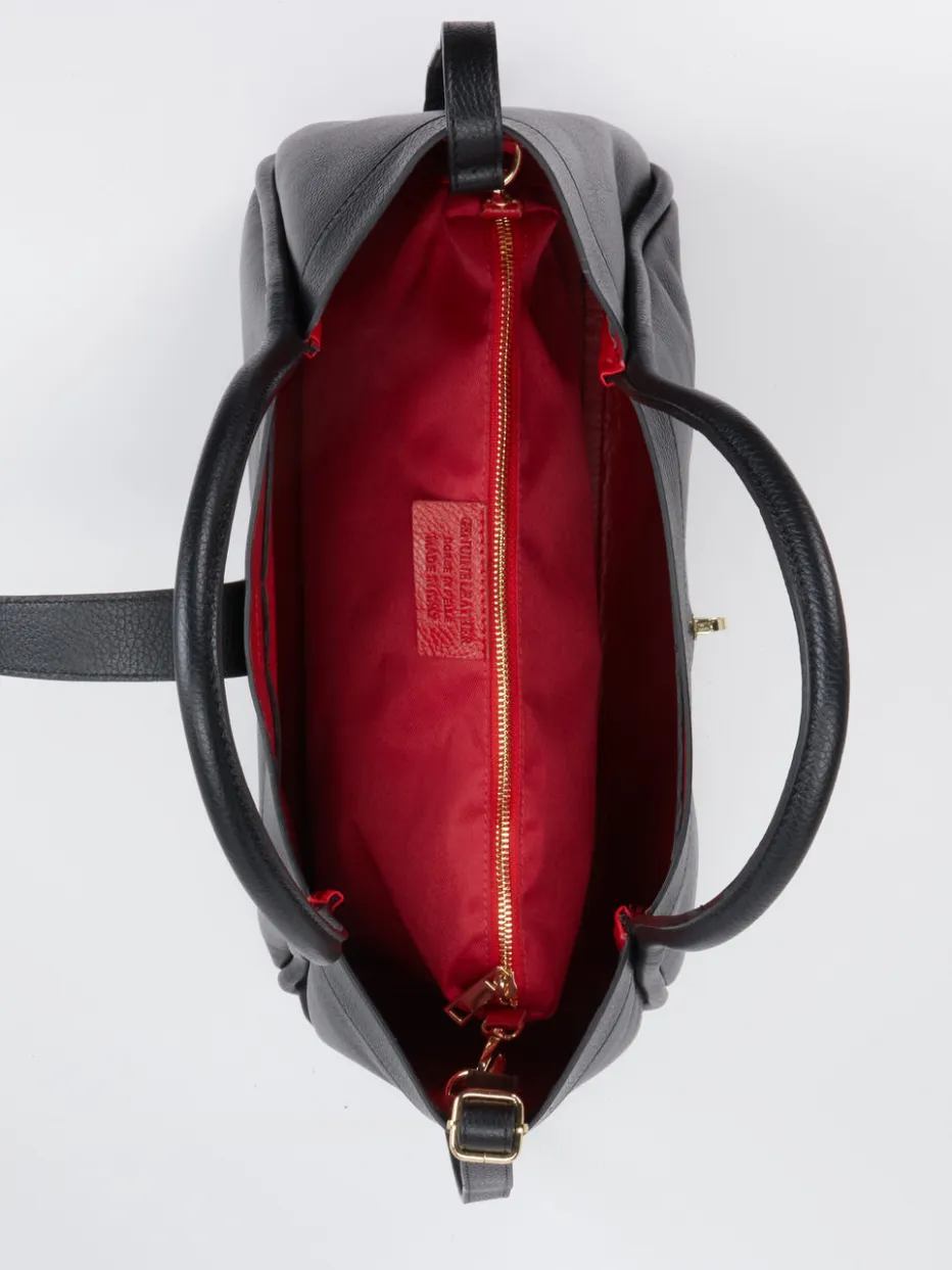 Ein hochwertiger Shopper, der mit genarbtem Kalbleder, goldfarbenen Details und rotem Innenfutter dezenten Luxus mit Funktionalität verbindet.