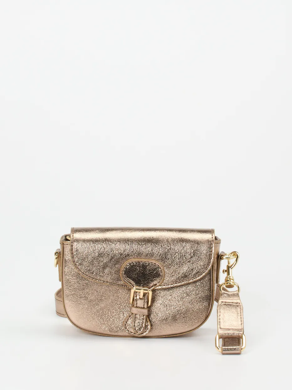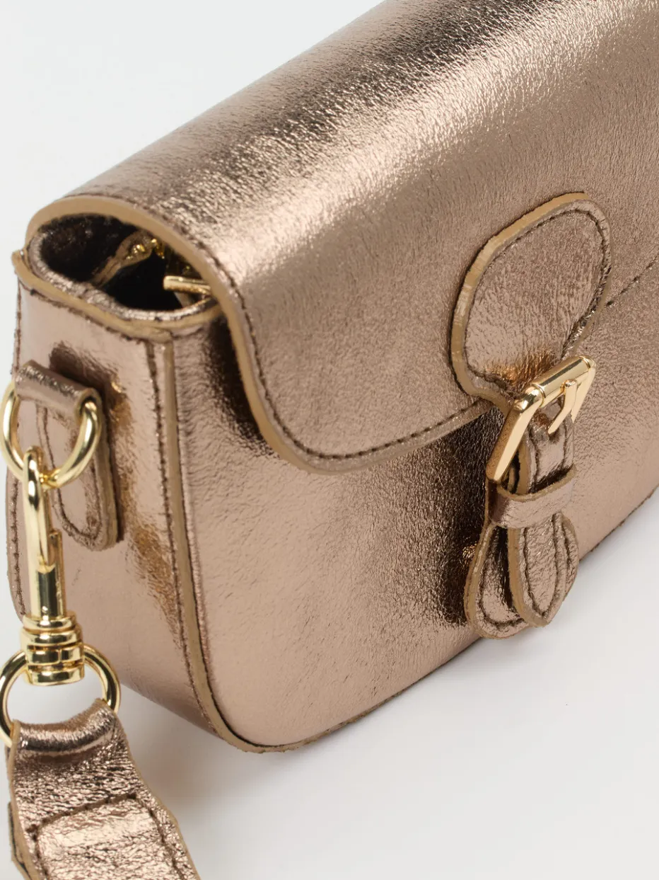 Die glänzende Metallic-Oberfläche in edlem Bronzegold verleiht der kompakten Crossbody Bag von Marlon Firenze einen luxuriösen Look mit zeitgemäßem Vintage-Twist.