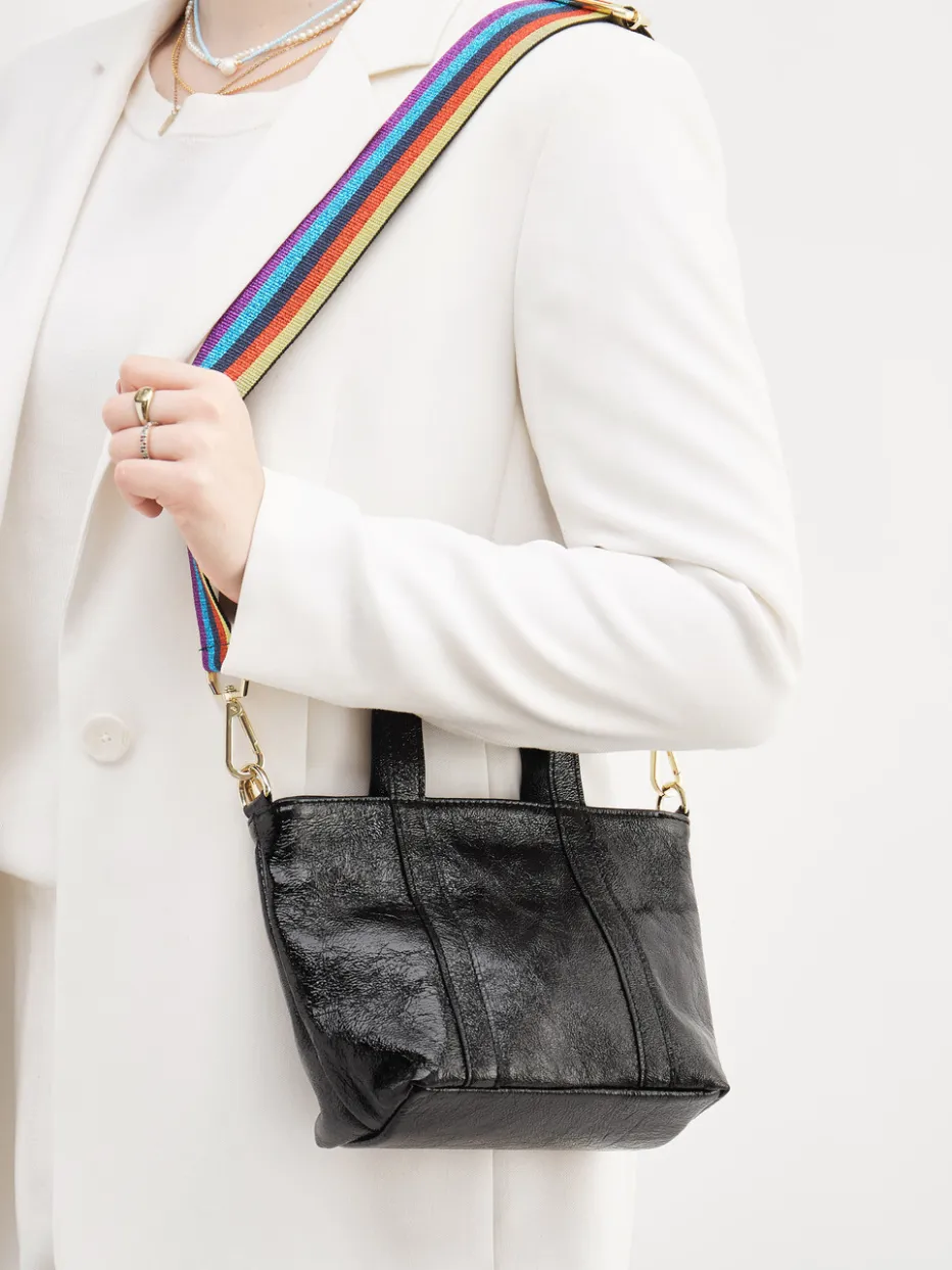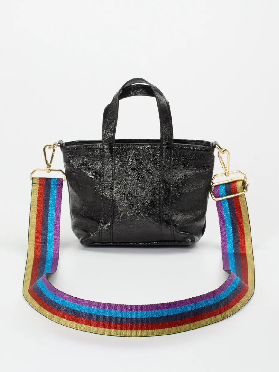 Diese Mini-Tote kombiniert das glänzende Finish von Metallicleder mit einem auffälligen Regenbogengurt – ein stilvoller Akzent für urbane Looks.
