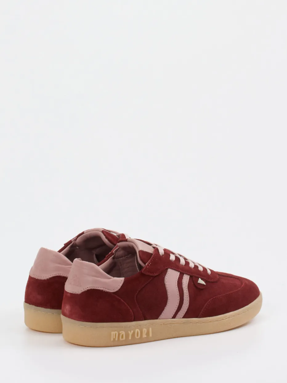 Ein trendstarker Retro-Sneaker von Mayori mit weinrotem Veloursleder, altrosa Akzenten und toniger Ziernaht – ideal für lässige Streetstyle-Looks.