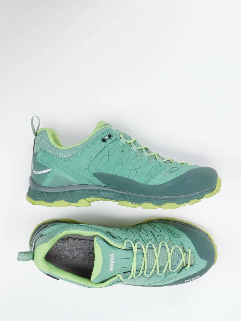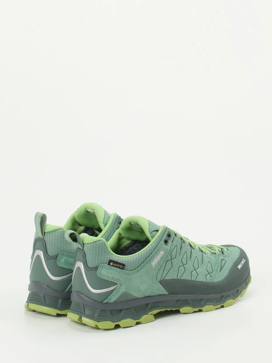 Bereit für den Trail.Meindl präsentiert mit diesem Low-Cut-Wanderschuh ein sportliches Highlight aus der Kategorie funktionaler Freizeitschuhe. Ob wechselhaftes Wetter oder längere Touren: Das robuste Obermaterial aus hellgrünem Veloursleder und atmungsaktivem Textil-Mesh überzeugt mit wasserdichter GORE-TEX-Membran. Die salbei- und lindgrünen Farbtöne prägen den sportlichen Look, ergänzt durch reflektierenden Fersenbesatz, verstärkte Zehenkappe und markante Ziernähte. Eine stark profilierte Vibram-Gummisohle sorgt für Traktion auf unterschiedlichsten Untergründen. Modisch im Trend liegend durch Gorpcore- und Techwear-Einflüsse, lässt sich der Schuh gut mit funktionalem Outdoor-Outfit oder sportlicher Freizeitkleidung kombinieren. Komfort trifft Outdoor-Erlebnis – mit bewährter Meindl-Qualität.