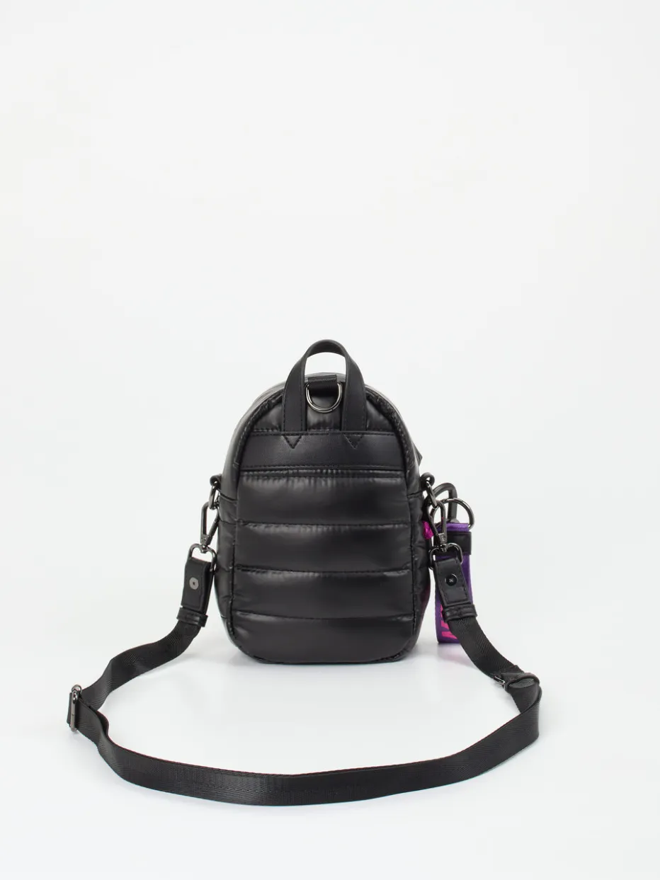 Der Mini-Rucksack von MRP verbindet glänzend gestepptes Nylon mit einem expressiven Farbakzent im Y2K-Stil – ein kompaktes Statement-Piece für modische City-Looks.