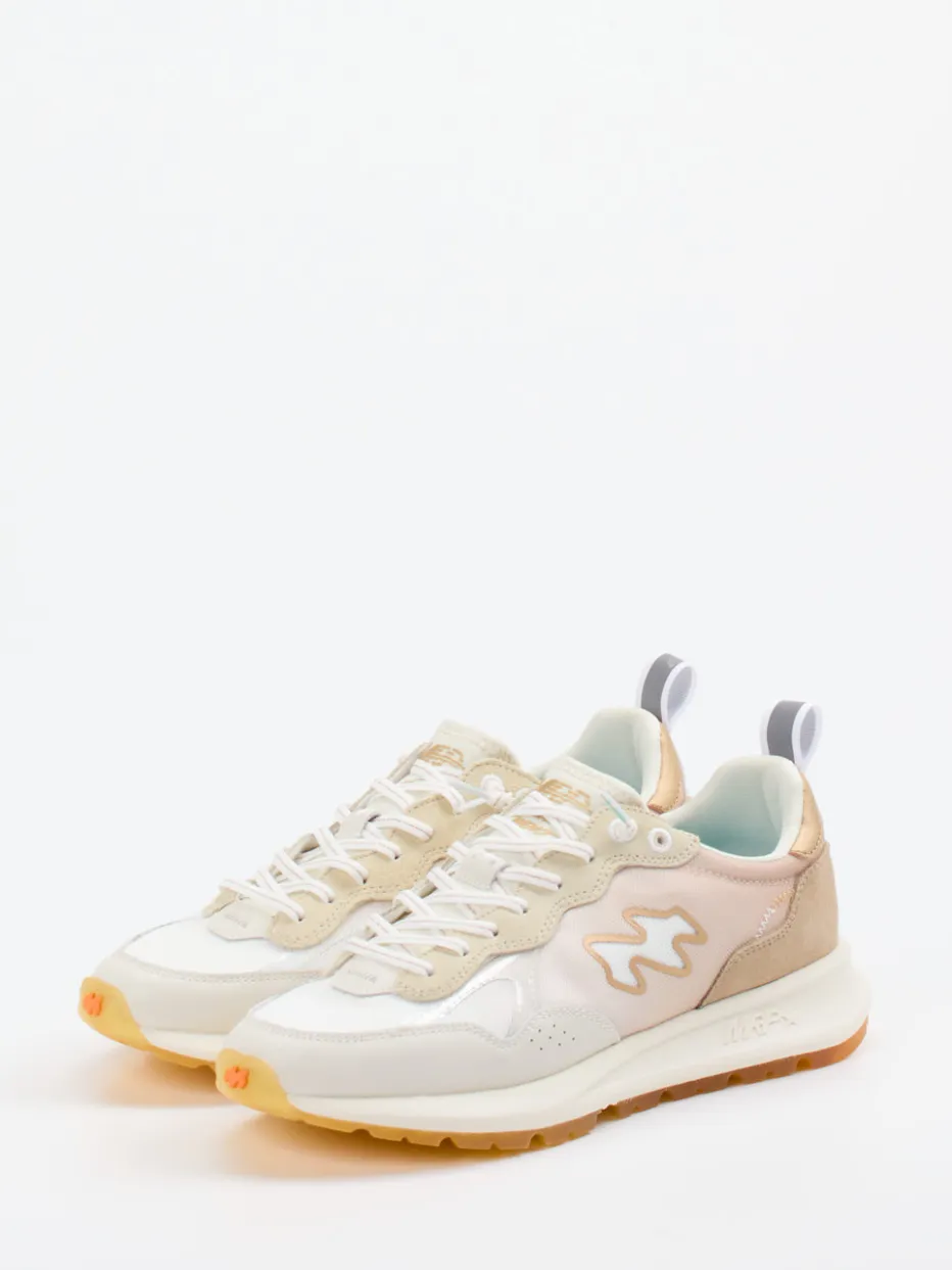 Ideal bei ausgedehnten Spaziergängen, verbindet das bequeme Modell eine leichte, stoßdämpfende Gummisohle mit einem Memory-Foam-Wechselfußbett. Der weiche Materialmix – samtig strukturiertes Veloursleder, Mesh und Glattlederimitat – zeigt sich in eleganten Beige- und Sandtönen mit weißem Farbverlauf. Reflektierende Elemente an der Ferse und eine rückseitige Zuglasche betonen den sportiven Streetwear-Look, der sich an aktuellen Retro-Tech-Trends orientiert. Perfekt kombinierbar mit Jogpants oder einer cremefarbenen Windjacke.