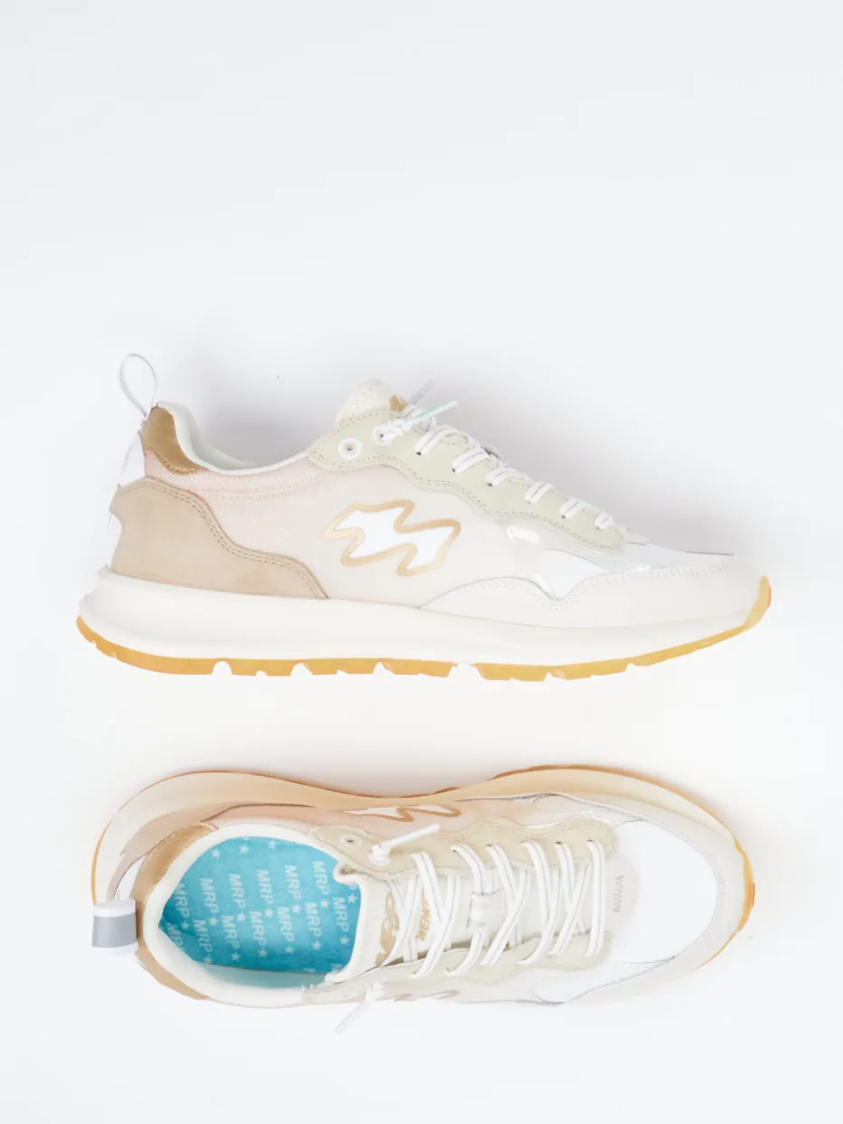 Der Sneaker von MRP verbindet sportliches Low-Top-Design mit einem fein abgestimmten Materialmix aus Velour und atmungsaktivem Textil.