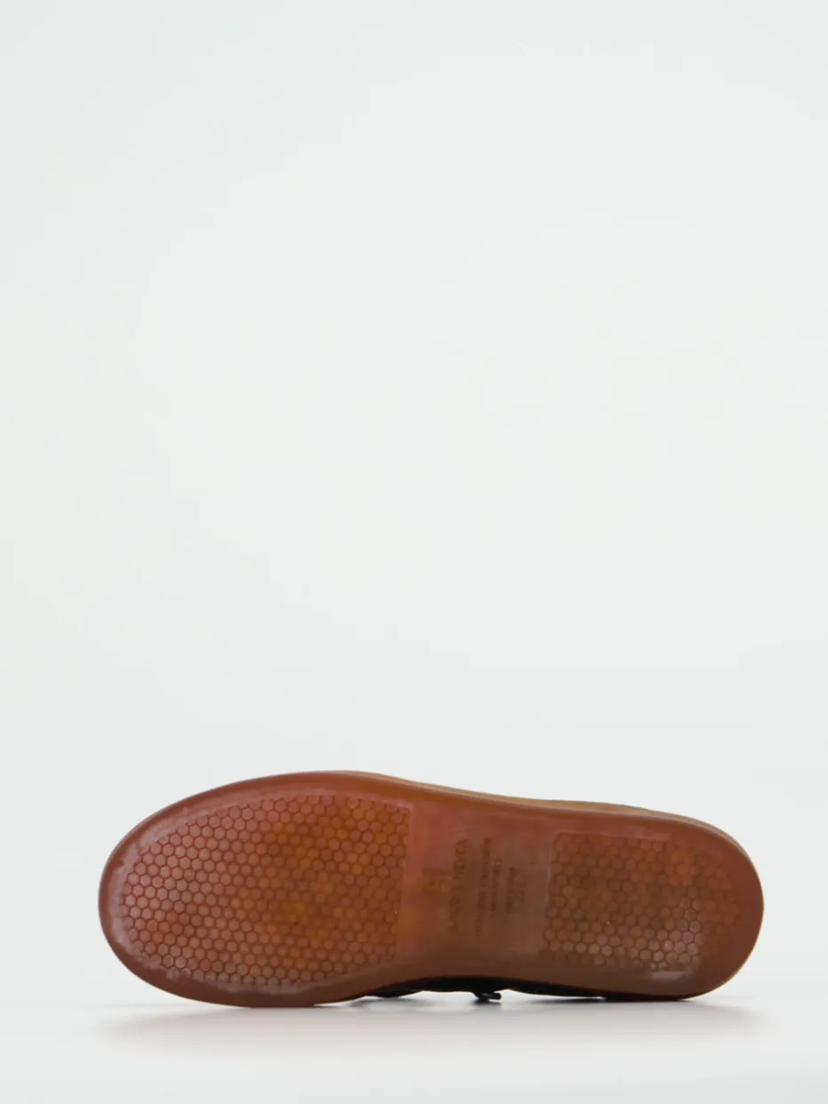 Für urbane Looks bei Arbeit und Freizeit eignet sich das Design mit klassisch-flacher Silhouette, das hochwertiges Veloursleder mit genarbtem Glattleder kombiniert. Der Materialmix wirkt durch deutlich sichtbare Steppnähte und die honigfarbene Gummisohle besonders wertig. Ein gepolsterter Fersenbereich erhöht den Komfort, während die strukturierte Sohle sicheren Halt bietet. Die Schnürung rundet den minimalistischen Look funktional ab – ideal zu Chinos und Lederaccessoires.