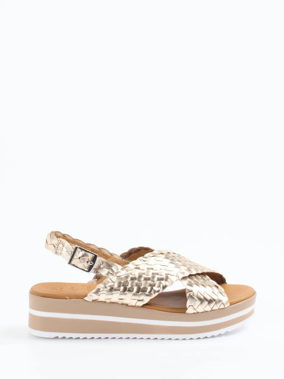 Stilvoller Glanz für sonnige Tage.Die spanische Marke Oh!My Sandals bringt mit dieser Plateau-Sandale ein elegantes Sommermodell für Frauen heraus. Ideal für Urlaub und Freizeit überzeugt die Sandale mit glänzendem Flechtleder in Champagner-Gold, das dank metallischer Akzente und gekreuzter Vorderfußriemen modisch hervorsticht. Der verstellbare Fersenriemen mit silberfarbener Dornschließe gewährleistet eine individuelle Passform. Die gepolsterte Innensohle und die stabile Gummisohle mit Plateau-Absätzen bieten hohen Komfort. Der Look erinnert an mediterranes Design mit minimalistischem Flair und liegt im Metallic- sowie Plattformtrend der Saison. Ein hochwertiger Sommerschuh voll Leichtigkeit und Anspruch – typisch Oh!My Sandals.