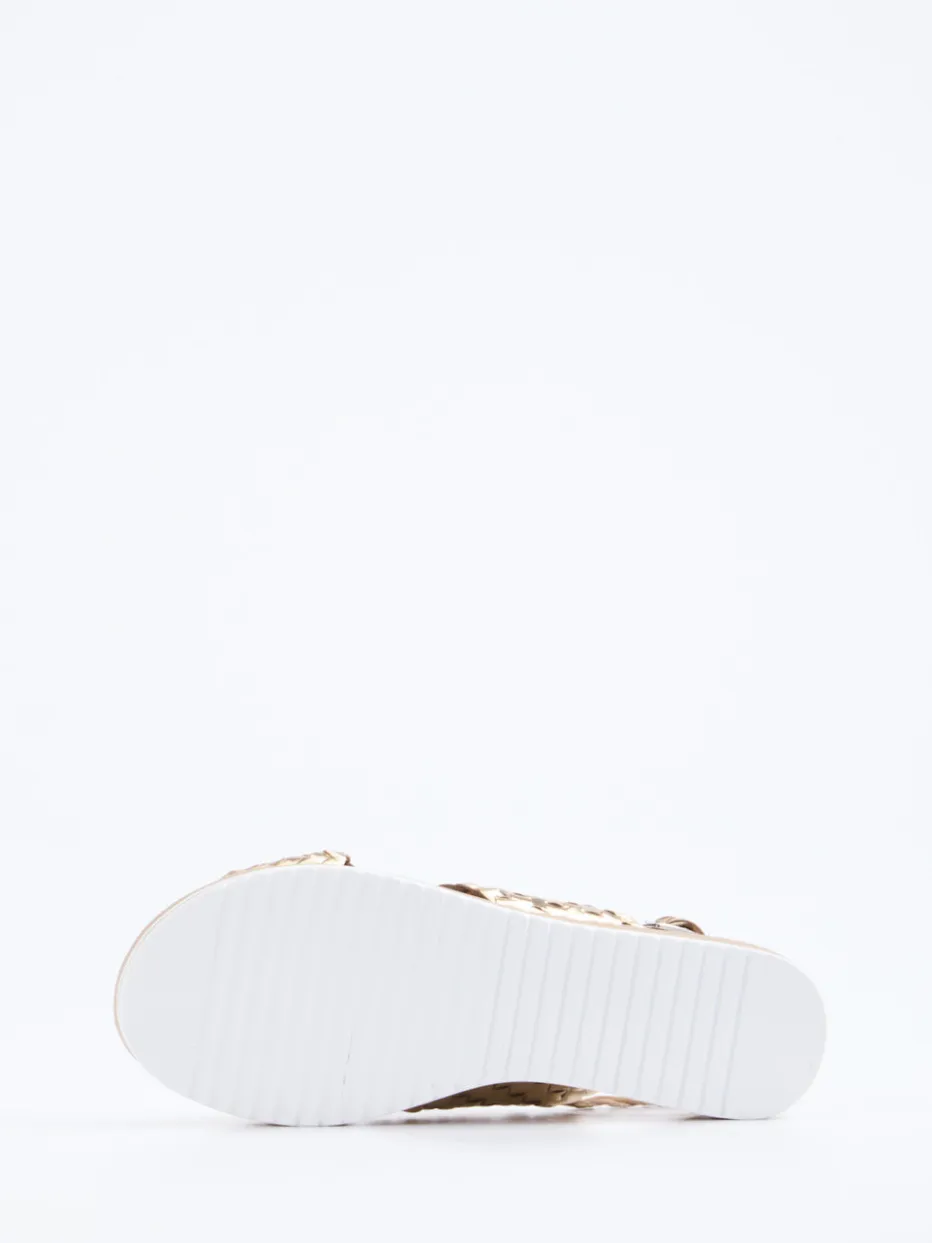 Die feine Flechtstruktur in champagner-goldenem Glanz betont das moderne Design und sorgt zusammen mit dem komfortablen Plateau für stilvolle Sommer-Momente.