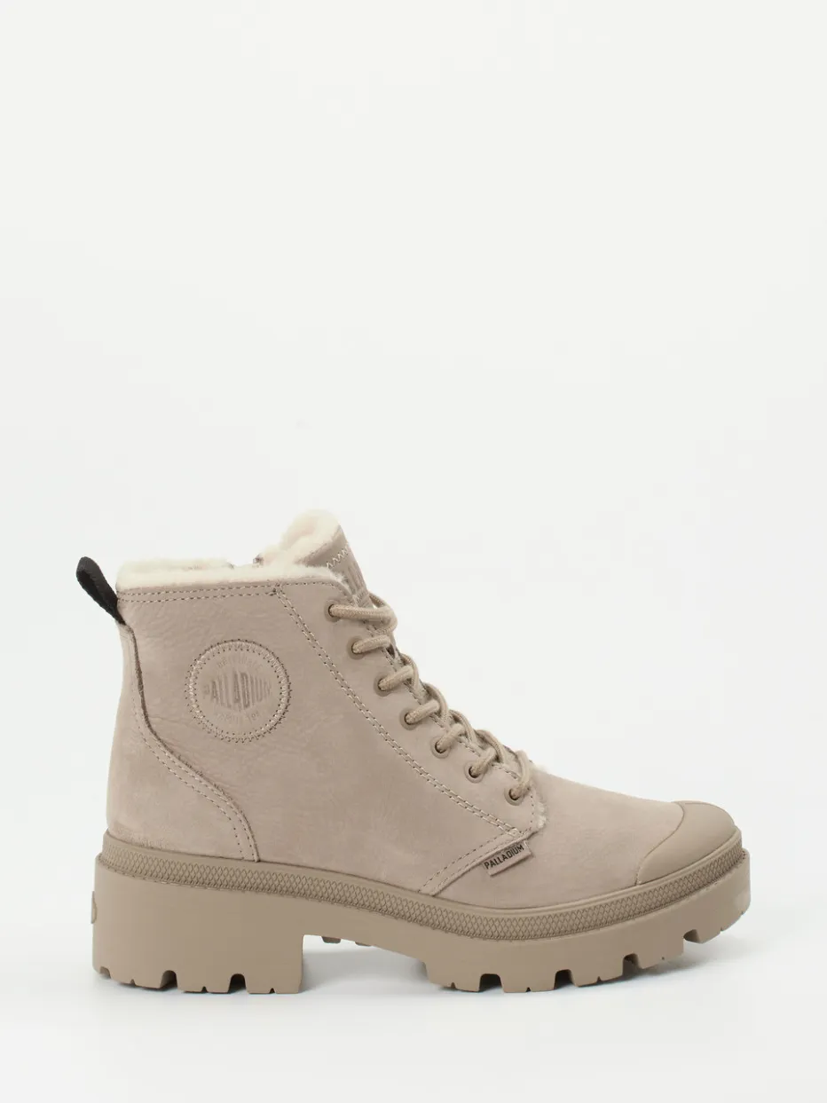 Stylisher Halt bei Winterwetter.Palladium präsentiert robuste Damen-Schnürboots für kalte Tage. Ob beim Stadtbummel oder auf winterlichen Spazierwegen – dieser knöchelhohe Schuh aus beigegrauem Nubukleder, samtig angeschliffen, überzeugt durch seine markante Utility-Silhouette. Ein warmes Innenfutter aus Kunstfell schützt zuverlässig vor Kälte, während die profilierte Gummisohle sicheren Grip bietet. Reißverschluss und Schnürung sorgen für komfortables An- und Ausziehen. Ton-in-Ton-Nähte und ein geprägtes Markenlogo runden den Streetwear-inspirierten Look ab. Harmoniert ideal mit Steppjacken oder Wollmänteln. Palladium vereint funktionales Design mit urbaner Alltagstauglichkeit.