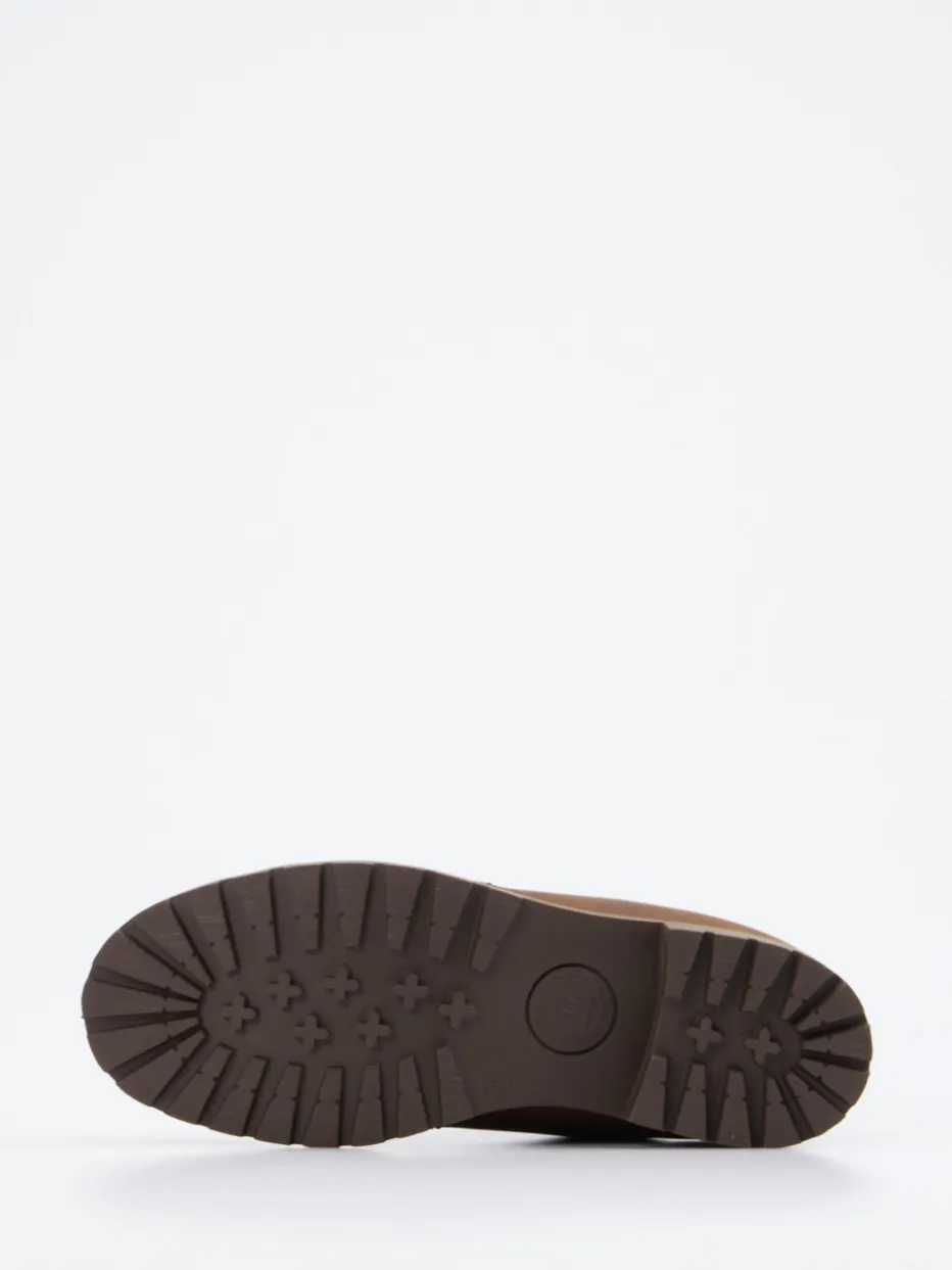 Wenn Halt bei jedem Schritt gefragt ist, liefert dieser knöchelhohe Boot mit griffiger Gummisohle die nötige Trittsicherheit. Das widerstandsfähige Fettleder in Mittelbraun kombiniert eine matte Oberfläche mit einer natürlichen Haptik und setzt mit kupferfarbenen Ösen sowie dezent geprägtem Logo rustikale Akzente. Die klare Silhouette folgt funktionalem Workwear-Stil, passend zum Quiet Outdoor-Trend. Optimal für naturverbundene Looks mit Jeans und Parka.