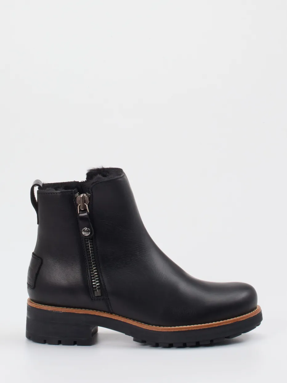 Robuste Eleganz für winterliche Wege.Panama Jack präsentiert mit dieser Stiefelette ein Damenmodell für die kalte Jahreszeit. Ideal für den Alltag zwischen Stadt und Natur, überzeugt die schwarze Stiefelette aus strapazierfähigem Kalbleder mit mattierter Oberfläche und warmem Textilfutter in Lammfelloptik. Seitliche Reißverschlüsse erleichtern den Einstieg, während braune Kontrastsohlen mit griffigem Profil und 4 cm hohem Blockabsatz sicheren Halt spenden. Die klassische, knöchelhohe Silhouette mit Zugschlaufe hinten verbindet Utility-Funktion mit lässigem Minimalismus im Stil des Quiet Luxury Trends. Perfekt zu Wollmantel oder Lederaccessoires. Verlässlicher Komfort trifft auf charakteristischen Outdoor-Stil von Panama Jack.