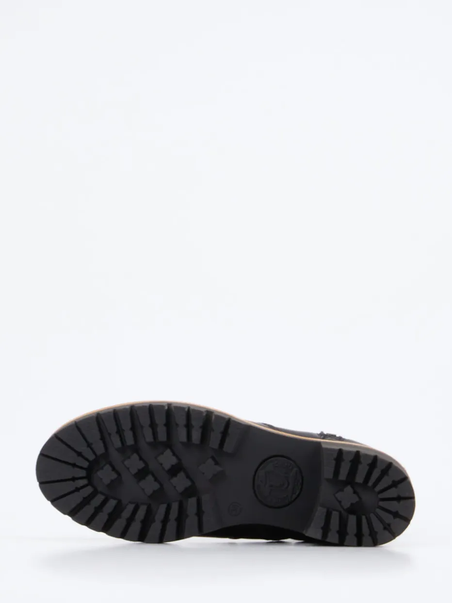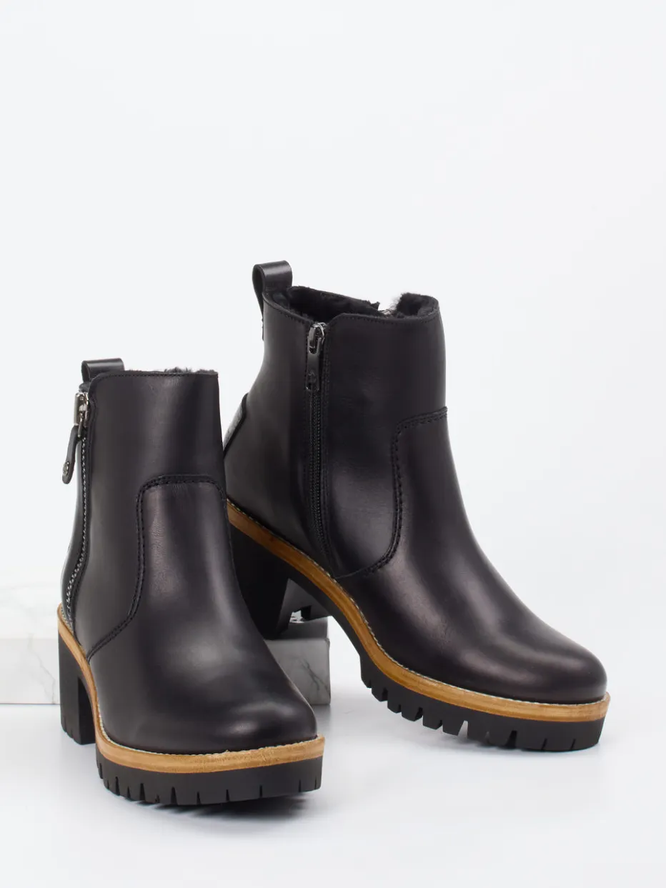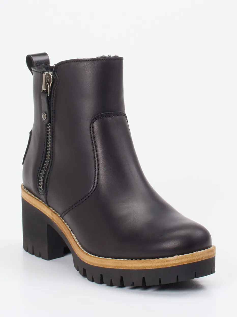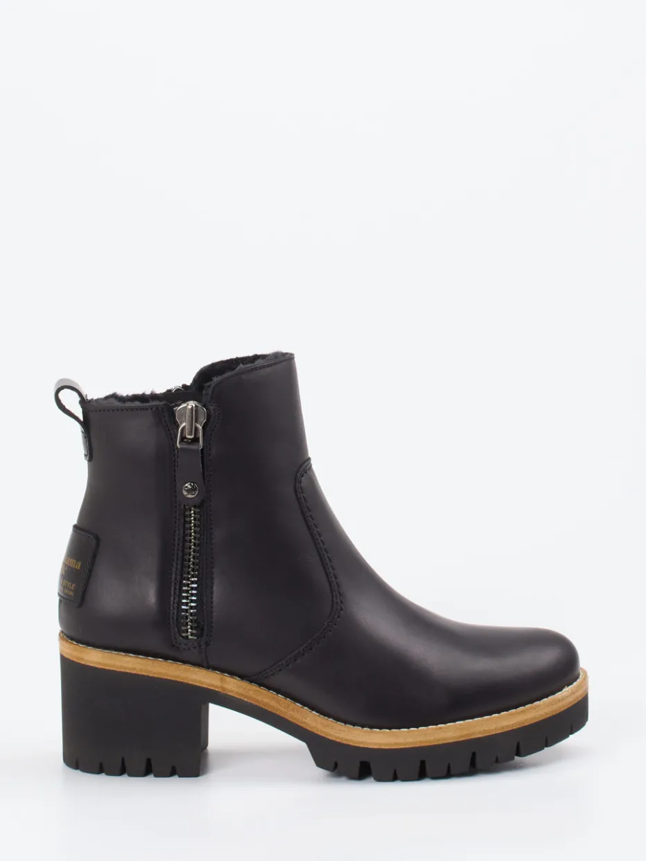 Komfort trifft klare Linie.Panama Jack präsentiert modische Damen-Stiefeletten für die kalte Jahreszeit. Ideal für winterliche Spaziergänge oder den urbanen Alltag: Diese schwarzen Stiefeletten aus hochwertigem, matt ausgeführtem Lammleder bieten durch das kuschelige Lammfellfutter optimalen Kälteschutz. Die klassische, knöchelhohe Silhouette wird durch silberfarbene Reißverschlüsse und eine kontrastierende Sohle in Holzoptik aufgewertet. Die 5,5 cm hohe Absatzsohle mit grobem Profil vereint Stabilität und Trendbewusstsein im Stil von „Quiet Luxury“. Ein dezenter Utility-Charakter rundet den Look ab. Panama Jack steht hier für zuverlässige Qualität mit stilvollem Outdoor-Charme.