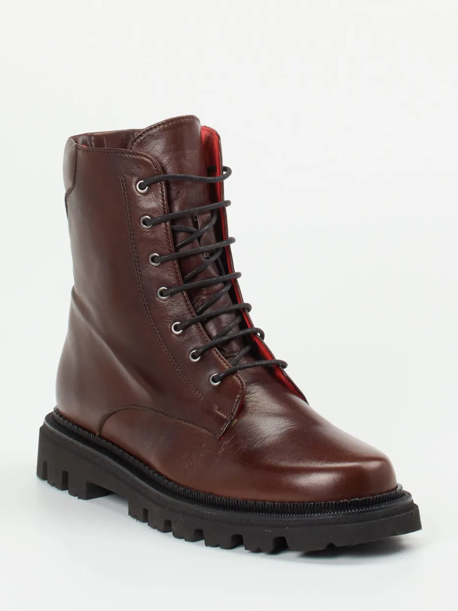 Stilvoll robust durch Herbst und Winter.Pas de Rouge präsentiert mit diesen Schnürboots ein Modell für Alltag und Freizeit mit Anspruch. Gefertigt aus hochwertigem Lammleder mit glatter, leicht glänzender Oberfläche in Kastanienbraun, überzeugt die klassische, hochschaftige Form mit einer Kombination aus Schnürung und seitlichem Reißverschluss. Auffällig: das Innenfutter aus Ziegenleder mit rotem Velourslederpatch an der Ferse – ein raffiniertes Detail mit Mehrwert. Die kräftige Profilsohle sorgt für Trittsicherheit. Inspiriert von Utility und Chunky-Trends im Winter 2024. Luxuriöser Komfort trifft handwerkliche Finesse aus der italienischen Schuhmanufaktur.