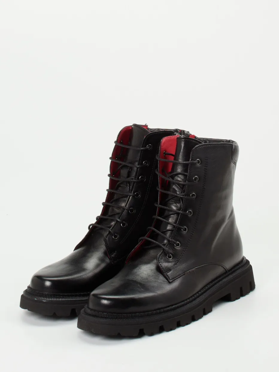 Pas de Rouge präsentiert mit diesen Schnürboots eine moderne Stiefelette für stilvolle Urbanwear. Wenn robuste Trittsicherheit und markantes Design gleichermaßen gefragt sind, bieten diese schwarzen Boots mit glänzendem Lammleder die ideale Lösung. Die klassische Silhouette wird durch eine Schnürung mit silberfarbenen Ösen und einen praktischen Reißverschluss betont. Ein besonderes Highlight: das intensiv dunkelrote Innenfutter aus Ziegenleder. Die stark profilierte Leichtzellsohle sorgt für Stabilität auf urbanem Terrain. Stilistisch verbinden sie Streetwear-Akzente mit Utility-Touch – perfekt zu Lederjacke und Rucksack. Ein Statement-Piece mit Komfort und Handwerkskunst von Pas de Rouge.