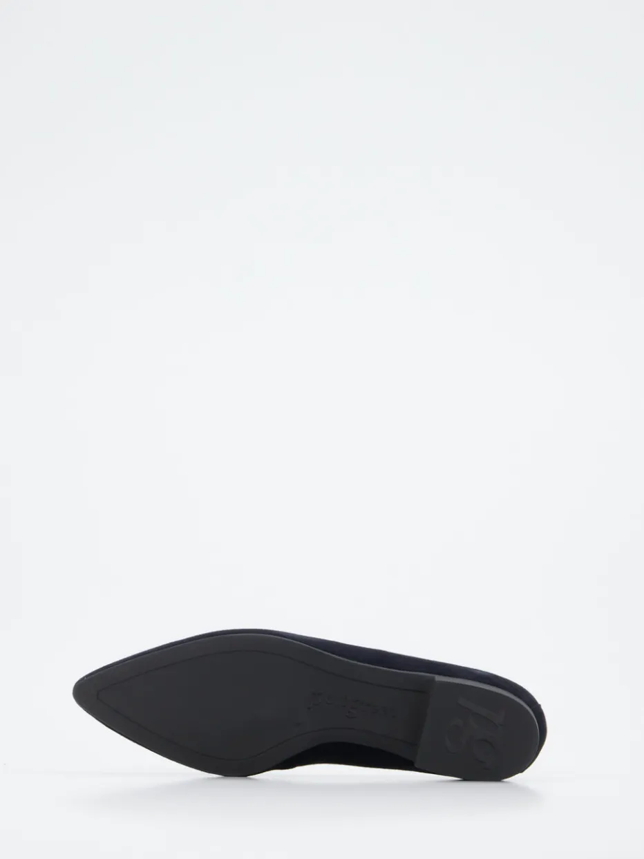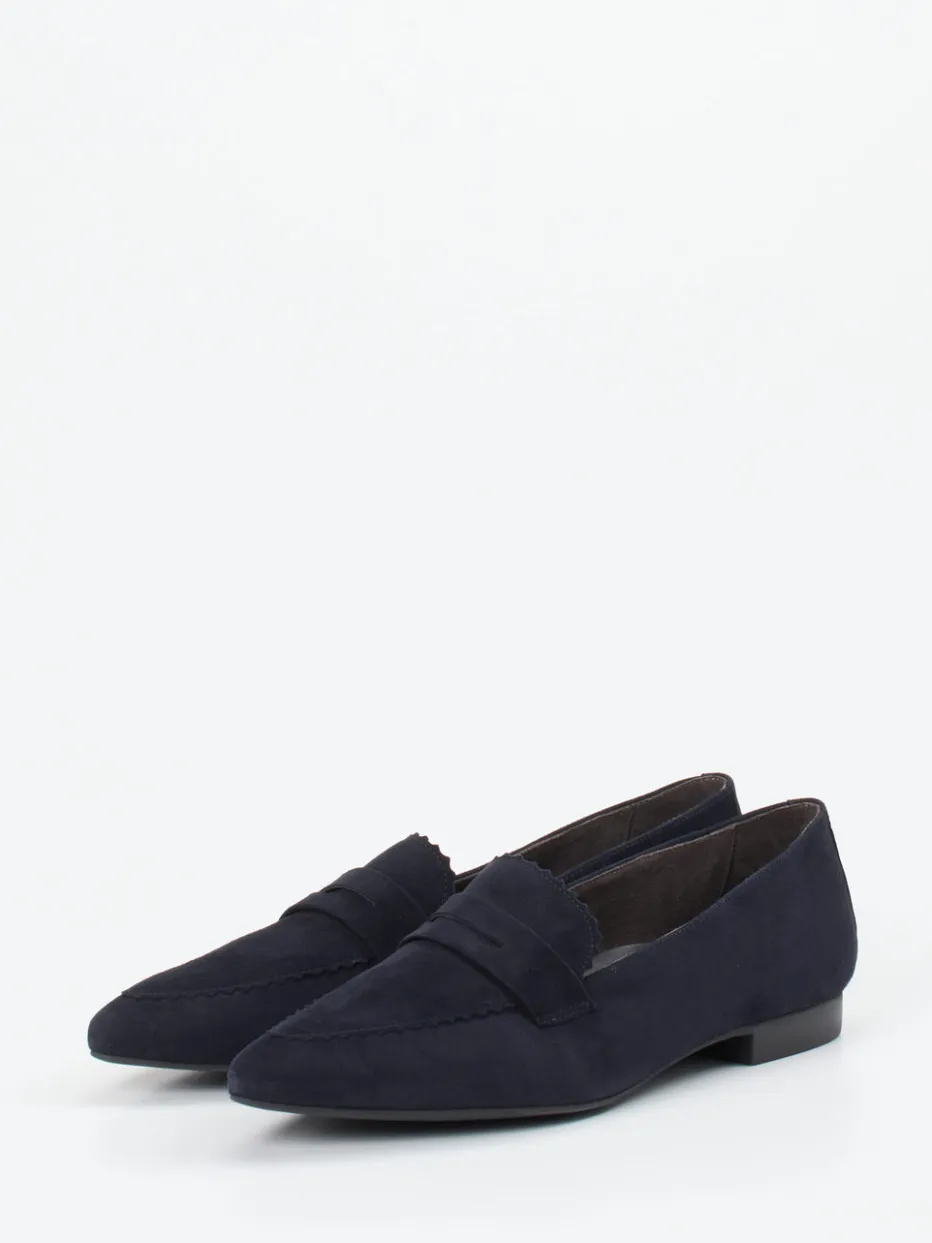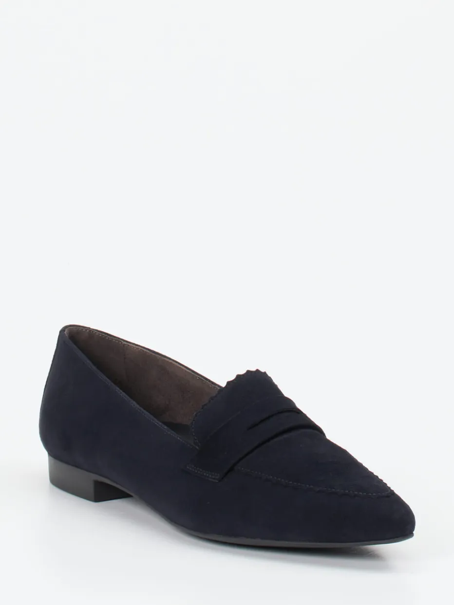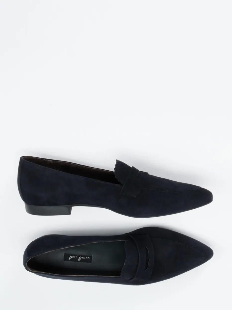 Zeitloser Stil trifft moderne Leichtigkeit.Paul Green präsentiert mit diesem Damen-Loafer ein stilvolles Modell für Alltag und Büro. Das samtig-matte Veloursleder in Dunkelblau unterstützt die spitz zulaufende Silhouette mit gezacktem Blatteinsatz und klassischer Penny-Zunge. Die flache, profilierte Gummisohle mit 1,5 cm Absatzhöhe sorgt gemeinsam mit dem ledernen Fußbett und weichem Futter für angenehmen Tragekomfort. Geprägt von Preppy Chic und Quiet Luxury, lässt sich das Design vielseitig kombinieren – etwa mit Stoffhose in Neutralfarben. Klare Linien, komfortable Leichtigkeit – Paul Green verbindet anspruchsvolles Design mit urbaner Tragbarkeit.