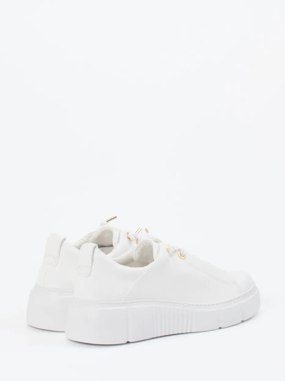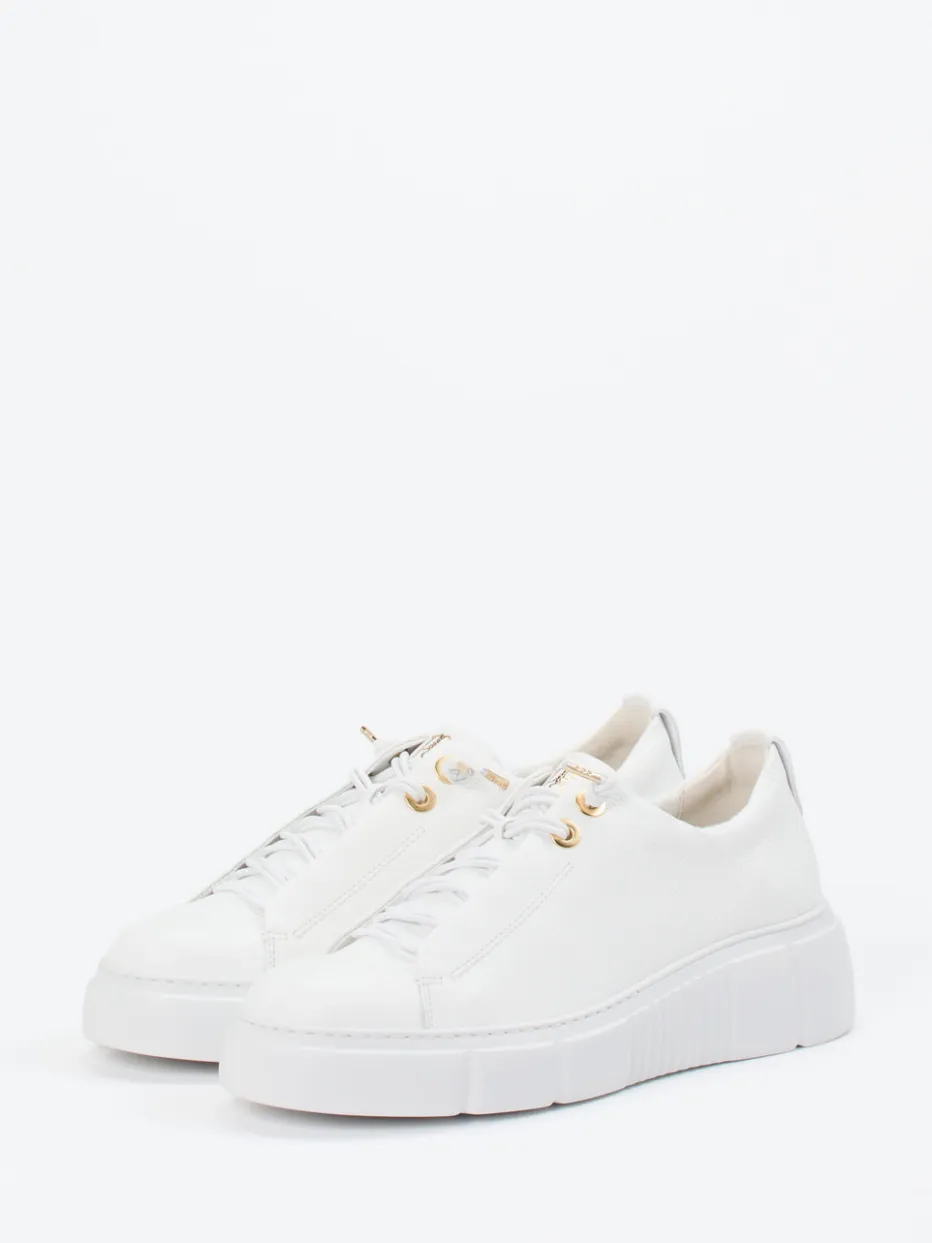 Ob beim Stadtspaziergang oder Wochenend-Trip – das fein genarbte Kalbleder in Weiß trifft den aktuellen Zeitgeist mühelos. Goldfarbene Metallösen und Endkappen setzen Akzente im minimalistischen Design. Die breite Gummisohle mit 4,5 cm Absatzhöhe sorgt für Komfort mit urbanem Anspruch, während Frotteefutter und Wechselfußbett Tragefreundlichkeit bieten. Stilistisch setzt das Modell auf dezente Streetwear-Elemente mit Influenz aus „Quiet Luxury“. Besonders harmonisch in Kombination mit hellen Tönen oder tonalen Looks.
