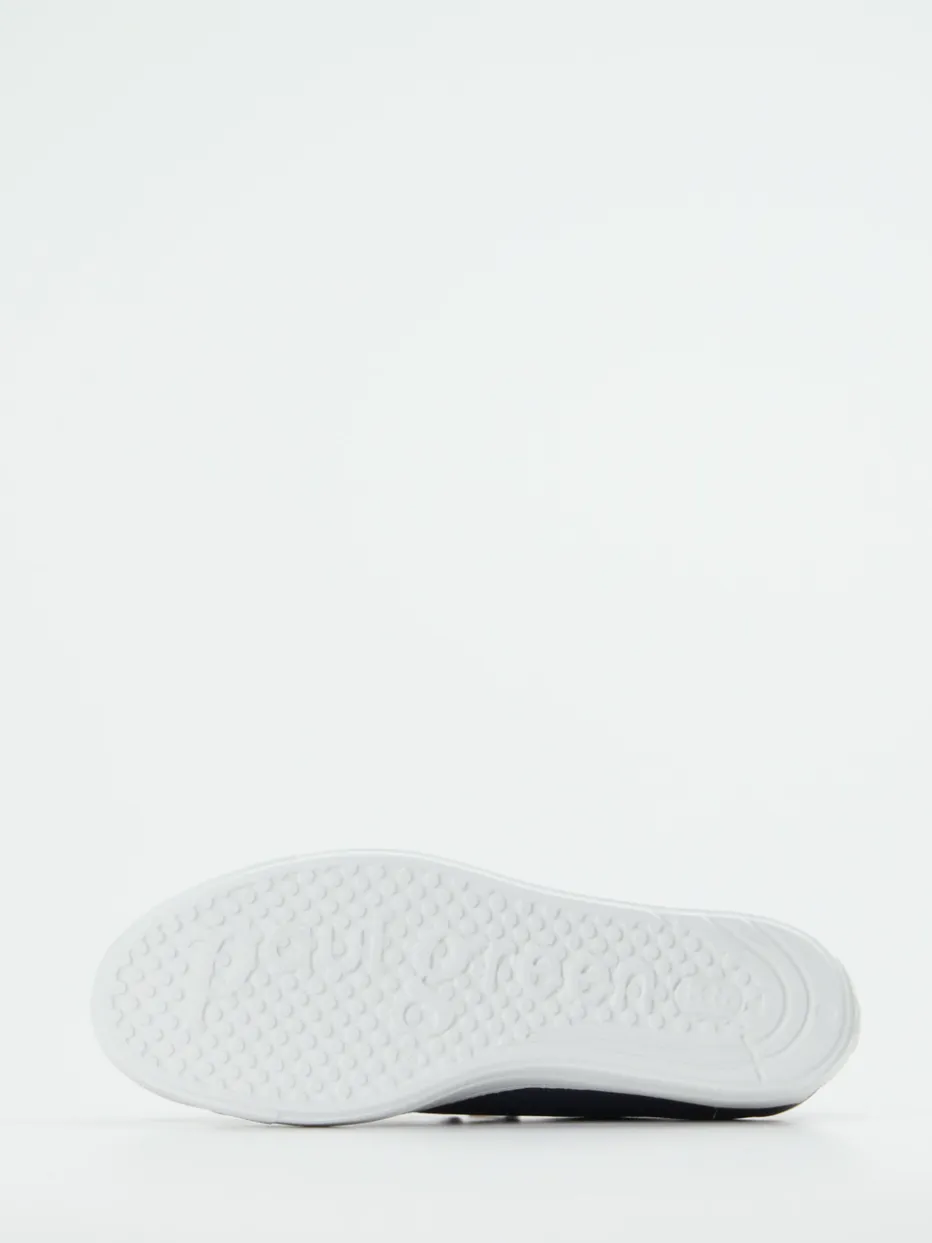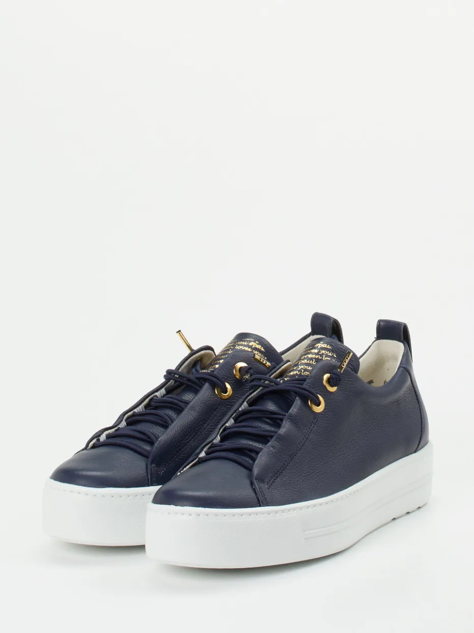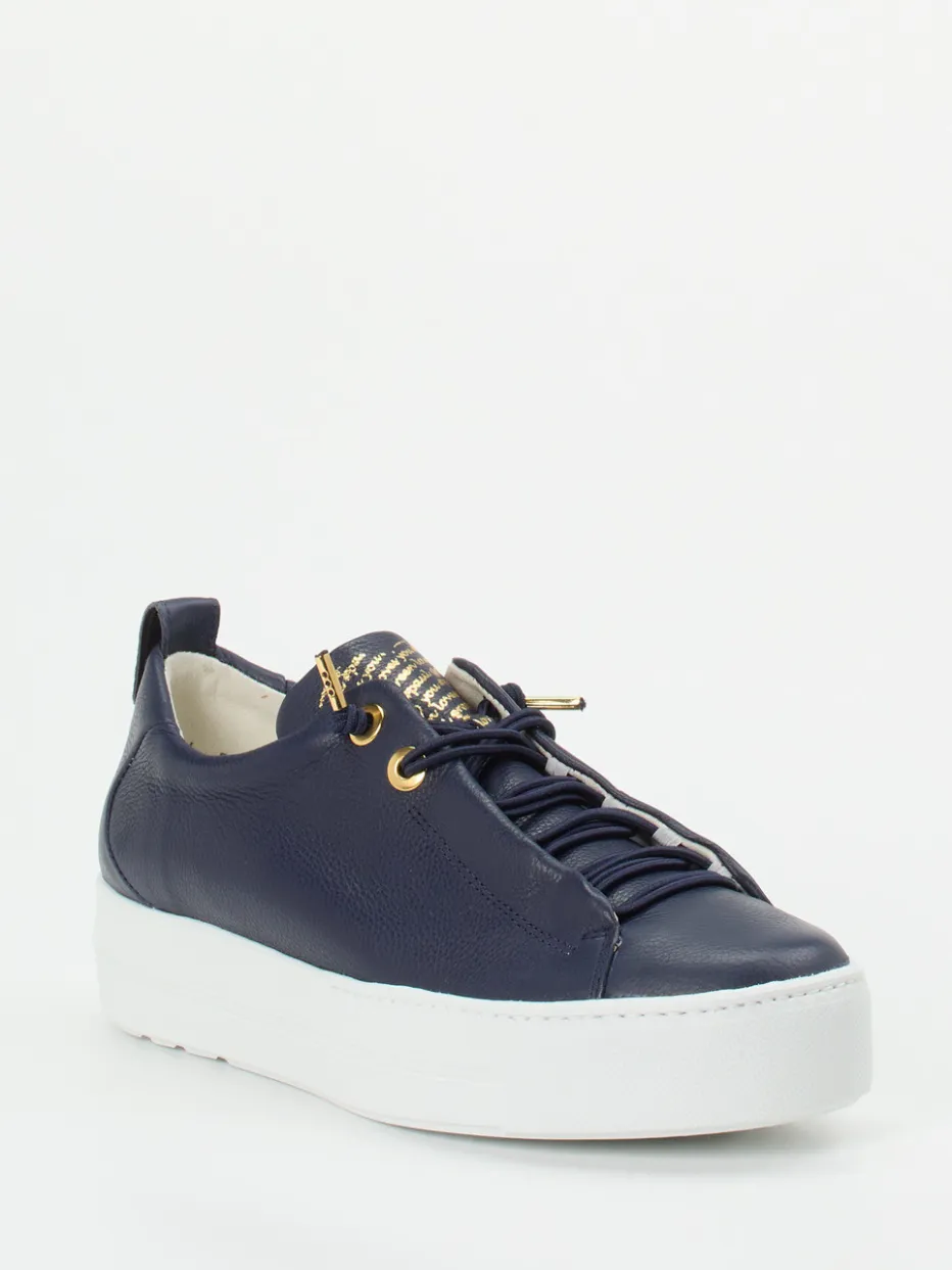 Ideal für ausgedehnte City-Touren oder entspannte Wochenenden überzeugt der Sneaker mit geschmeidigem Kalbleder in dunkelblauer, genarbter Optik. Goldfarbene Metallösen, eine bedruckte Zunge und eine praktische Zuglasche am Fersenbereich akzentuieren das klare Design. Die weiße Profilsohle aus Gummi sorgt für sicheren Halt und unterstreicht die moderne Plateau-Form, während die elastische Schnürung Komfort und Flexibilität bietet. Der Look passt perfekt zu minimalistischer Streetwear und lässigen Alltagsoutfits.