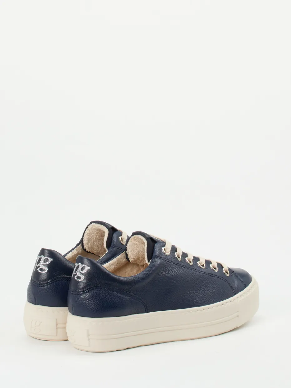 Urbaner Minimalismus in edlem Leder.Paul Green präsentiert diesen sportiv-eleganten Damen-Sneaker für moderne Alltagsmomente. Sein samtig genarbtes Kalbleder in Dunkelblau schmiegt sich sanft an den Fuß und harmoniert stilvoll mit der cremeweißen Gummisohle in bequemer Plateau-Optik. Silberfarbene Ösen und fein gestickte Logos auf der Zunge und Ferse verleihen dem klaren Design dezente Akzente. Die elastische Schnürung sorgt für angenehme Bewegungsfreiheit, während die SuperSoft-Innensohle und das Innenfutter aus Frottee den Tragekomfort erhöhen. Inspiriert vom aktuellen „Plateau-Sneaker Revival“ lässt er sich hervorragend zu monochromen Casual-Looks kombinieren. Ein stilvoller Begleiter mit Qualitätsversprechen von Paul Green.
