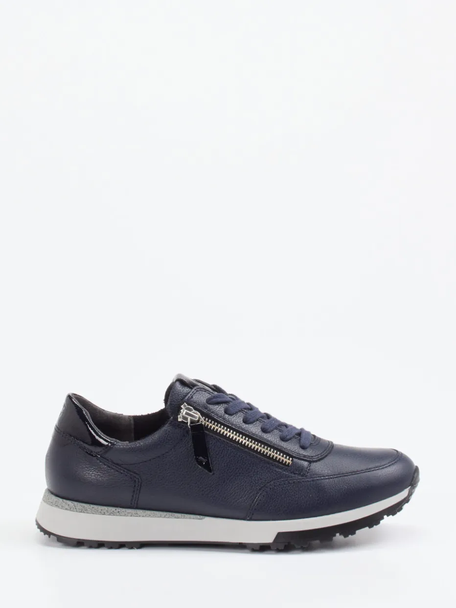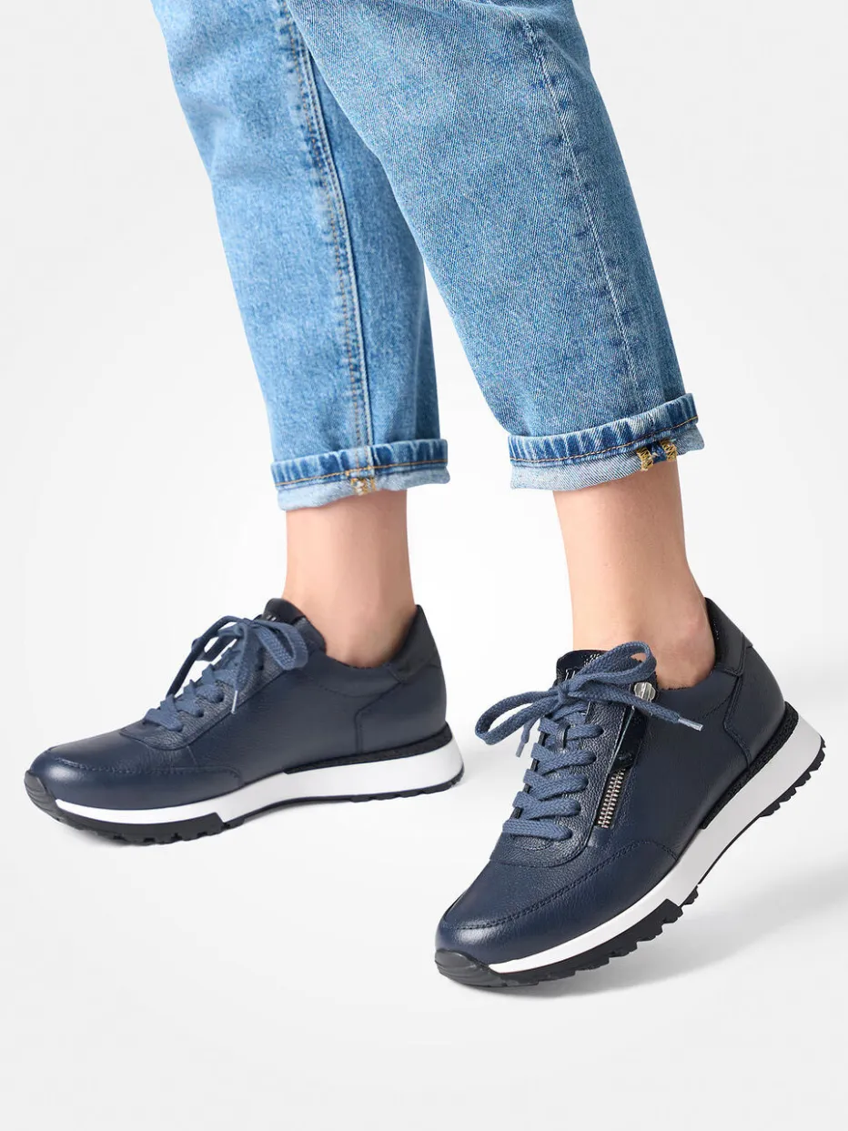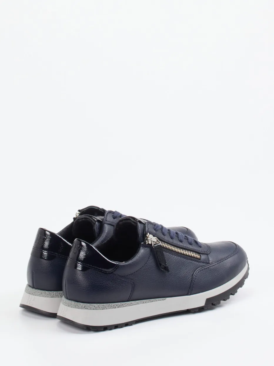 Komfort trifft urbanes Stilbewusstsein.Paul Green präsentiert einen Low-Top Sneaker für Damen, gefertigt aus dunkelblauem, genarbtem Kalbleder. Ideal für dynamische Alltagswege oder den lässigen Büro-Look: Der Sneaker überzeugt mit seitlichem Reißverschluss für einfaches An- und Ausziehen, schweißabsorbierendem Textilfutter und bequemem Wechselfußbett. Die griffige Profilsohle unterstützt die natürliche Abrollbewegung des Fußes. Designhighlights wie die glänzende Lackleder-Fersenkappe und silberfarbene Details unterstreichen den dezent-edlen Charakter. Kombinierbar mit Jeans, Hosenanzügen oder Jersey-Kleidern. Ein athletischer Alltagsbegleiter mit Qualitätsanspruch von Paul Green.