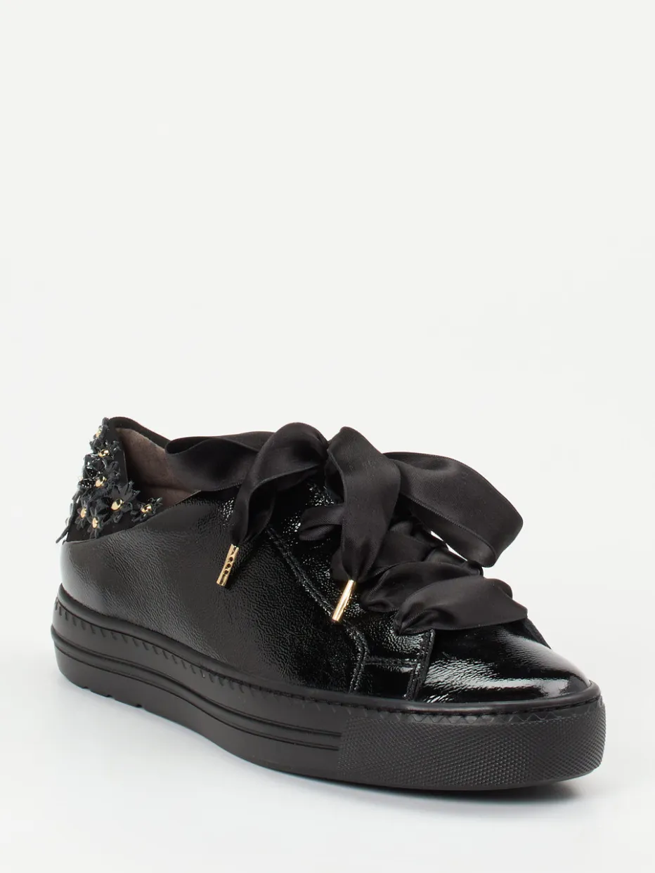 Verführerischer Glanz in femininer Silhouette.Die Marke Paul Green präsentiert einen auffallenden Damen-Sneaker mit glänzender Lacklederoberfläche. Für stilbewusste Freizeitmomente oder den urbanen Auftritt vereint das Modell schwarzes, hochwertig verarbeitetes Lackleder mit samtigen Satinschnürbändern. Die klassisch gehaltene Low-Top-Silhouette erhält durch florale Applikationen an der Ferse mit Perlendetails eine romantische Note. Goldfarbene Akzente an Ösen und Schnürenden setzen zusätzliche Highlights. Die Gummisohle mit leichter Erhebung bietet Alltagstauglichkeit und Komfort. Das Design trifft den Trend veredelter Streetwear mit femininer Raffinesse. Paul Green überzeugt mit Kombination aus handwerklicher Qualität und ausdrucksstarkem Style.