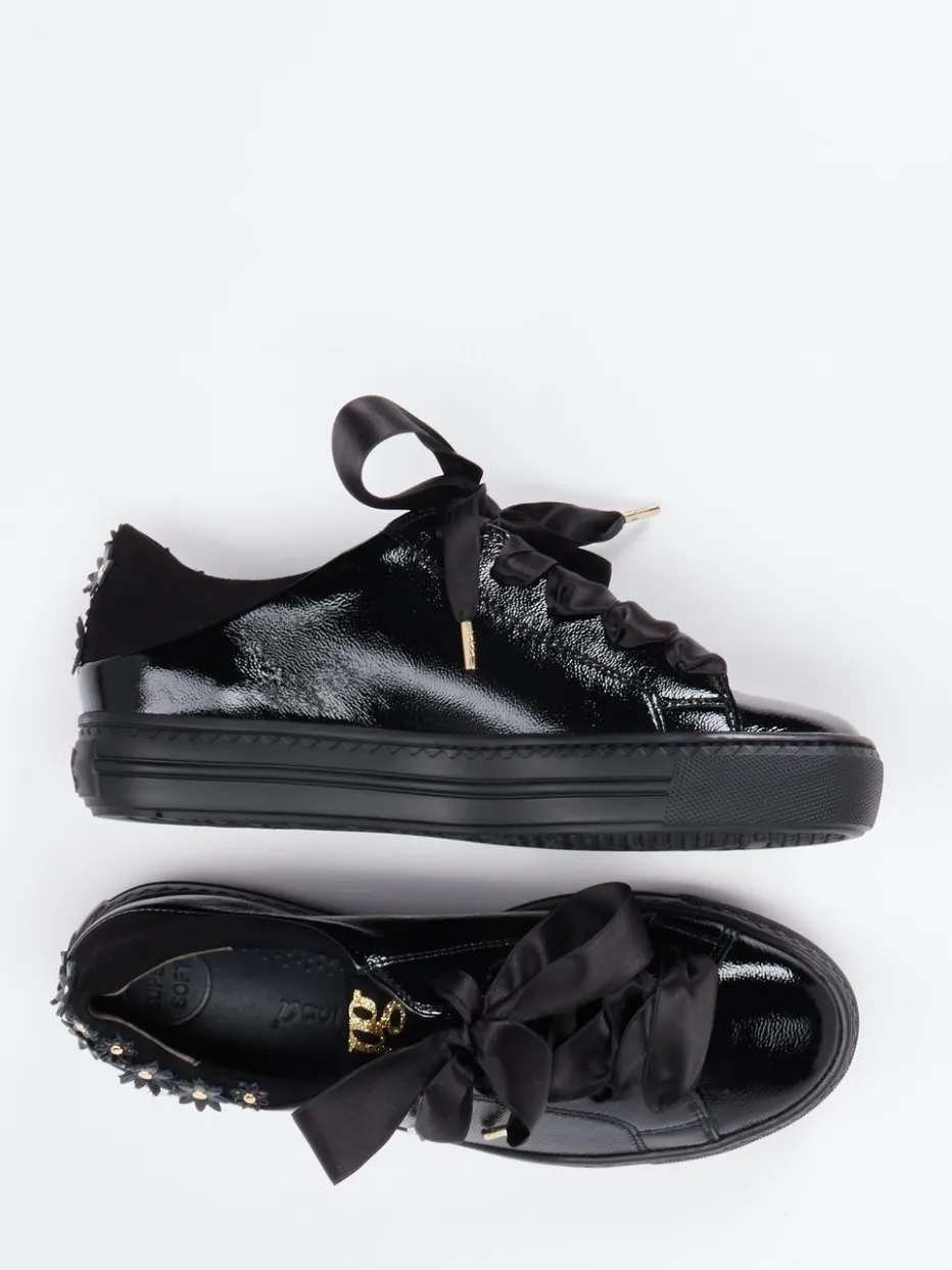 Glänzendes Lackleder und aufwendige Details wie Satinbandschnürung und florale Applikationen machen diesen Sneaker zu einer stilvollen Ergänzung modischer Alltagslooks.