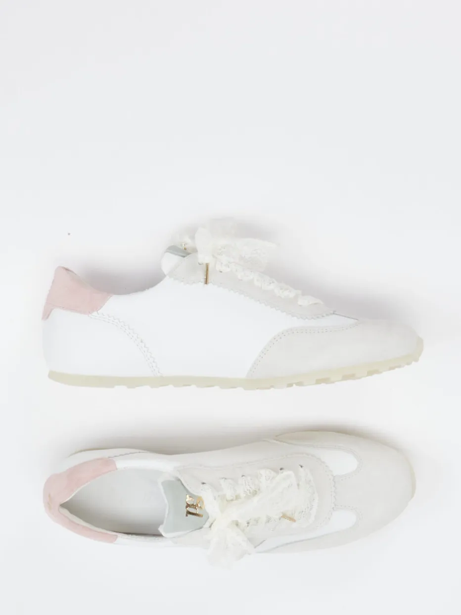 Dieser feminine Sneaker kombiniert pastellfarbene Akzente, zarte Spitzendetails und einen hochwertigen Materialmix zu einem trendbewussten Freizeit-Allrounder.