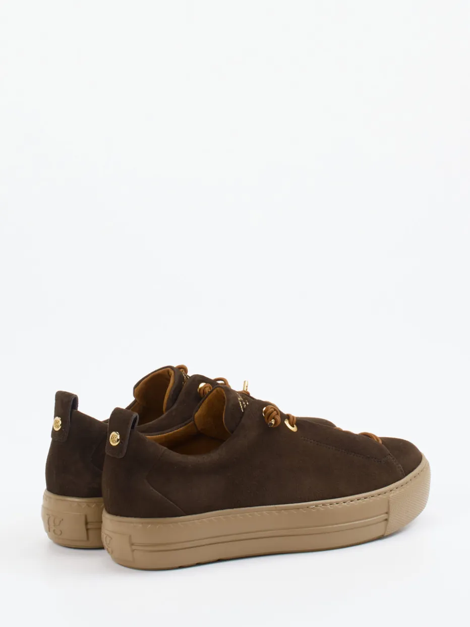 Komfort trifft auf Understatement.Paul Green präsentiert mit diesem Damen-Sneaker ein Modell, das Stilbewusstsein und Alltagstauglichkeit mühelos vereint. Ob zu langen Bürotagen oder herbstlichen City-Spaziergängen – das samtig angeschliffene Nubukleder in tiefem Dunkelbraun bietet angenehmen Tragekomfort und maximale Kombinierbarkeit. Goldfarbene Ösen und tonige Nähte setzen elegante Akzente, während die taupefarbene Plateausohle mit 3,5 cm Höhe für eine moderne Silhouette sorgt. Die abgerundete Form, elastische Schnürung und Logo-Details auf Zunge und Ferse unterstreichen den urban-minimalistischen Charakter. Perfekt zu Naturtönen, Kaschmir oder Lederaccessoires. Ein Sneaker mit Stilautorität und Wohlfühlfaktor – typisch Paul Green.