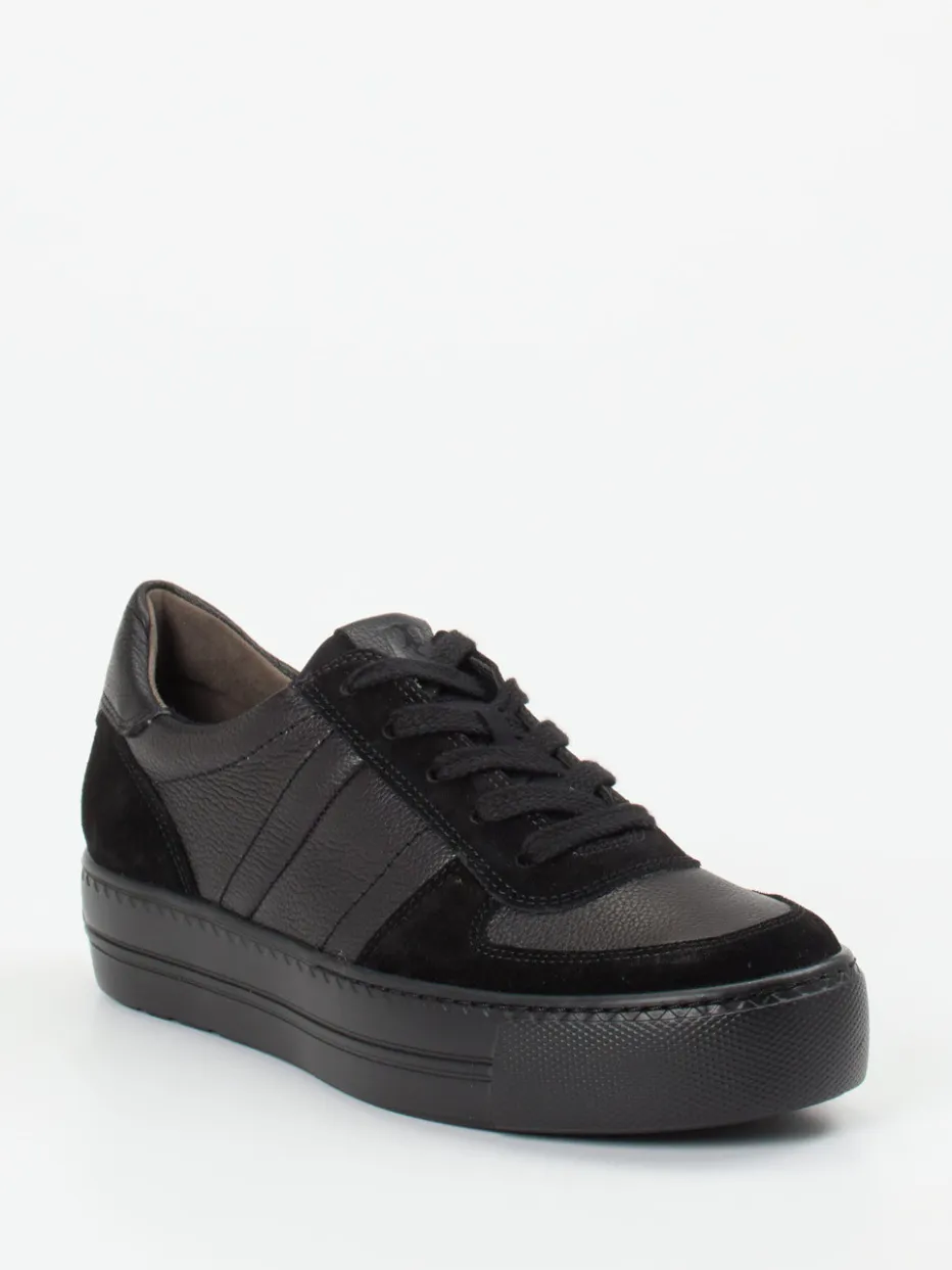 Minimalistisch. Monochrom. Alltagstauglich.Dieser Damen-Sneaker von Paul Green verbindet stilvolle Schlichtheit mit hochwertigen Materialien. Für entspannte Citytage oder entspannte Alltagslooks konzipiert, überzeugt das schwarze Modell durch einen edlen Mix aus genarbtem Glattleder und samtigem Veloursleder. Die klassische, runde Form wird durch eine Schnürung ergänzt, während die erhöhte Gummisohle mit leichtem Plateau angenehmen Laufkomfort bietet. Ton-in-Ton gehalten passt der Sneaker zu monochromen Outfits sowie modernen Streetwear-Looks und unterstreicht den Materialtrend der Saison. Paul Green steht für handwerkliche Veredelung und stilbewusste Funktionalität.