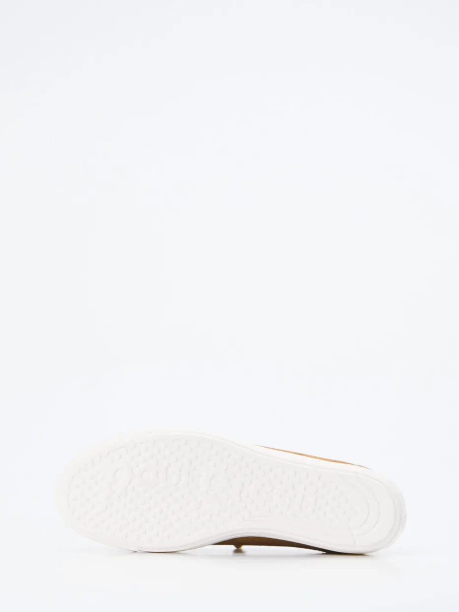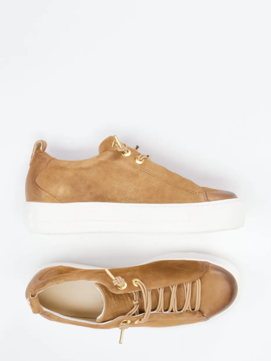 Der cognacfarbene Sneaker von Paul Green kombiniert weiches Veloursleder mit einer sportlich-eleganten Plateauform. Dezente Goldakzente und ein natürlicher Farbton unterstreichen den modernen Minimalismus.
