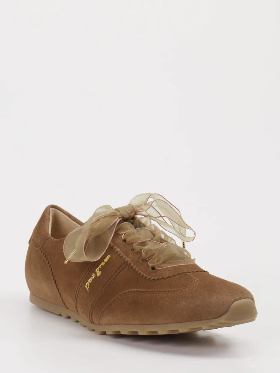 Feminines Design trifft auf Retro-Flair. Paul Green zeigt mit diesem Damen-Sneaker ein Modell, das Eleganz und Komfort stilsicher vereint. Ideal für entspannte Freizeit-Looks bietet der Sneaker aus hochwertigem Veloursleder in Mittelbraun einen matten, sanften Look. Das klassische Low-Top-Design wird durch transparente Organza-Schnürsenkel mit goldfarbenen Enden veredelt, während eine dezente Logoprägung stilvolle Akzente setzt. Die flache Form und die rutschhemmende Profilsohle aus Gummi sorgen für angenehmes Laufgefühl – perfekt für den Alltag. Modisch greift der Schuh die Trends „Quiet Luxury“ und „Sheer Details“ auf und passt ideal zu entspannten Casual-Outfits. Ein femininer Allrounder mit Komfort und Stil – typisch Paul Green.