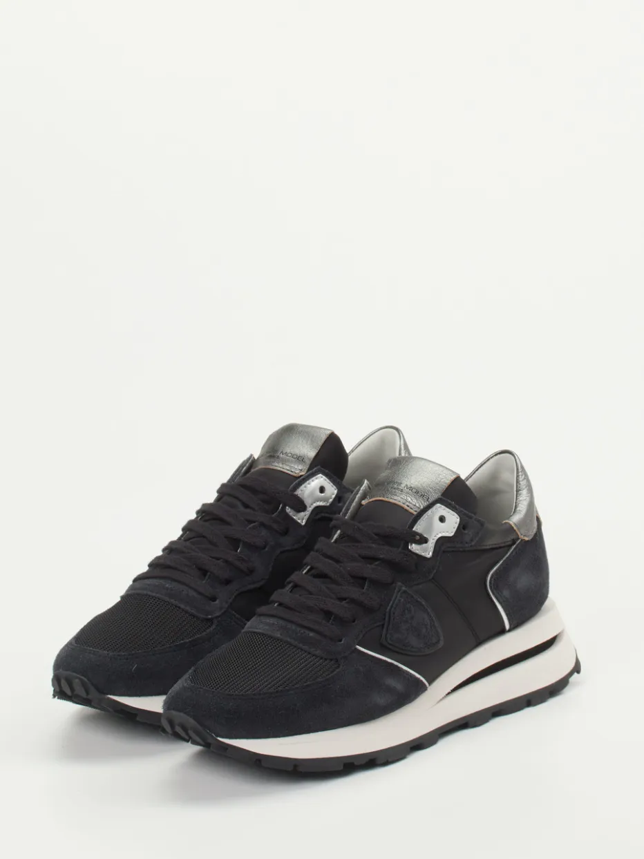 Retro trifft modernen Streetstyle.Philippe Model interpretiert den klassischen Retro-Sneaker in sportlich-eleganter Weise. Ideal für urbane Alltagsmomente überzeugt das Modell durch einen hochwertigen Materialmix aus samtig angeschliffenem Veloursleder, luftigem Meshgewebe und silbernem Glattleder mit Metallic-Finish. Die tiefschwarze Farbgebung wird durch silberne Highlights und eine schwarz-weiße Kontrastsohle dynamisch akzentuiert. Eine gepolsterte Zunge, Profilgummisohle und weiches Frotteefutter mit Memory-Foam sorgen für Komfort. Als Teil des aktuellen „Metallic Accents“-Trends eignet sich der Sneaker besonders für trendorientierte Looks. Markentypisch stilvoller Komfort mit sportiver Präzision.