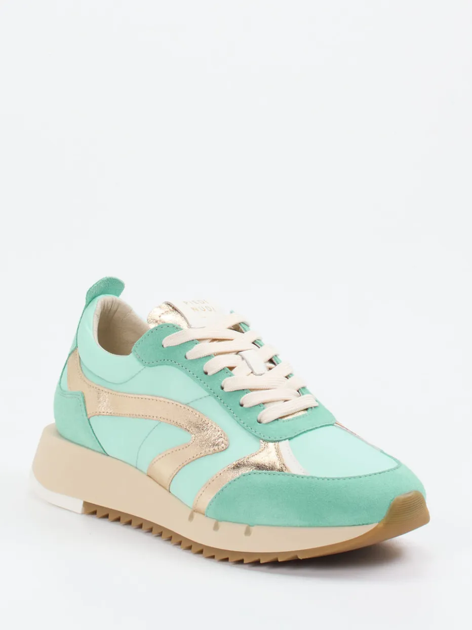 Ideal für entspannte Alltagstage oder die nächste Urlaubsreise bietet dieser Schuh Tragekomfort in H-Weite, ergänzt durch ein wechselbares Softfußbett. Die Kombination aus Veloursleder und Textil verleiht dem Modell eine matte, zugleich strukturierte Oberfläche. Pastellfarbenes Mintgrün dominiert das Design, akzentuiert durch goldmetallische Highlights und eine beigefarbene Keilsohle mit markantem Profil. Seine klassische Runner-Silhouette mit Schnürverschluss spiegelt angesagte Streetwear-Ästhetik wider. Metallic-Akzente und Logo-Details sorgen für einen trendbewussten Auftritt, besonders reizvoll zu verkürzten Hosen oder fließenden Röcken.