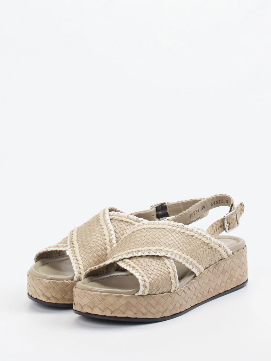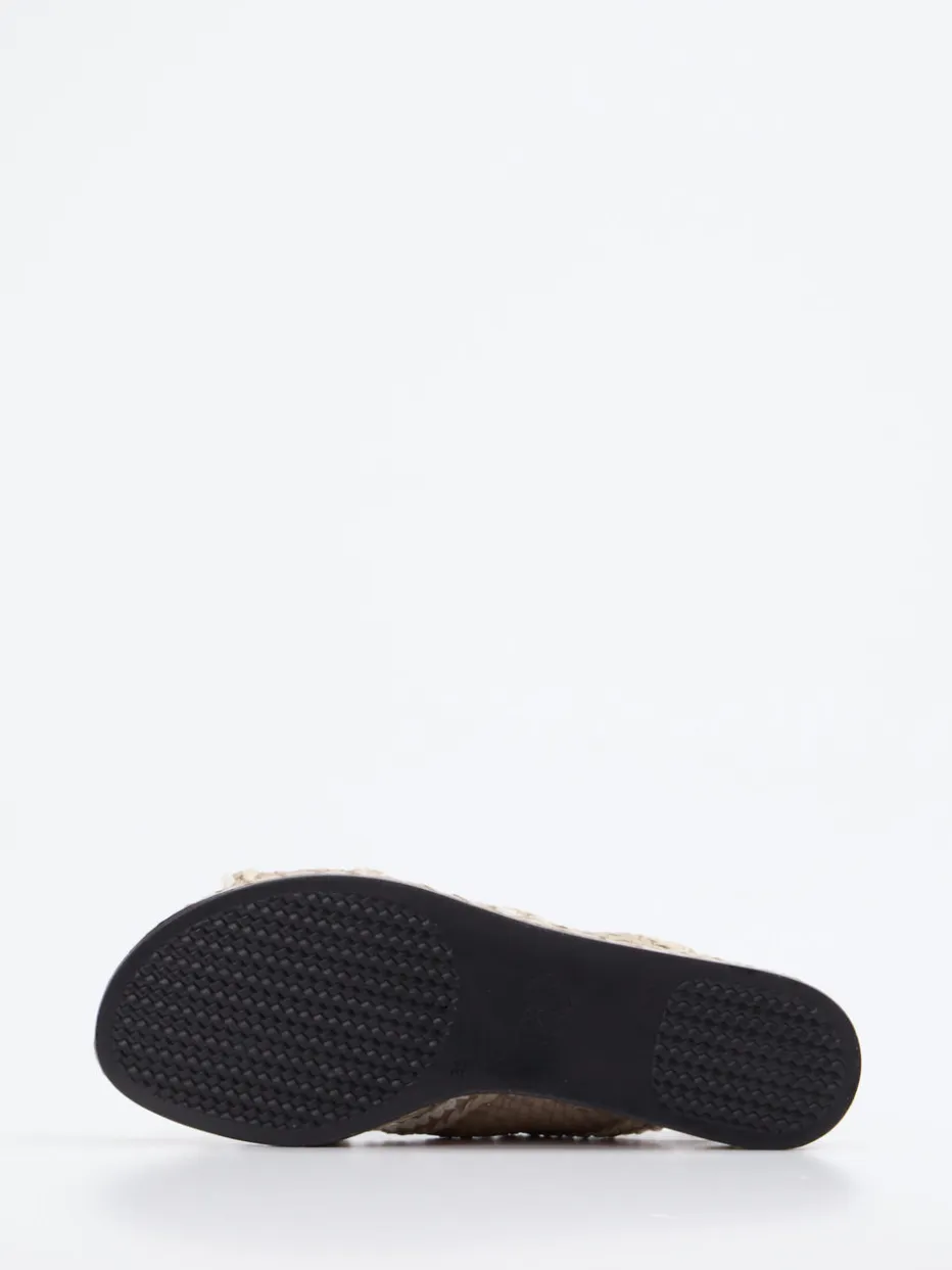 Ideal für Urlaubsflair und entspannte Alltagssituationen verbindet dieses Modell beiges Flechtleder mit einer markanten, weißen Kontrastpaspelierung. Die gekreuzten, matt strukturierten Riemen und der individuell verstellbare Fersenriemen mit Metallschnalle formen eine offene, plateauartige Silhouette. Eine leichtgewichtige Gummisohle mit integriertem Keil sorgt für Tragekomfort – rutschhemmend und alltagstauglich. Inspiriert von Boho-Elementen und mediterranen Trends passt sie besonders schön zu Naturmaterialien wie Leinen oder Bast.