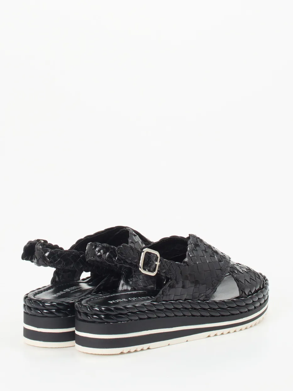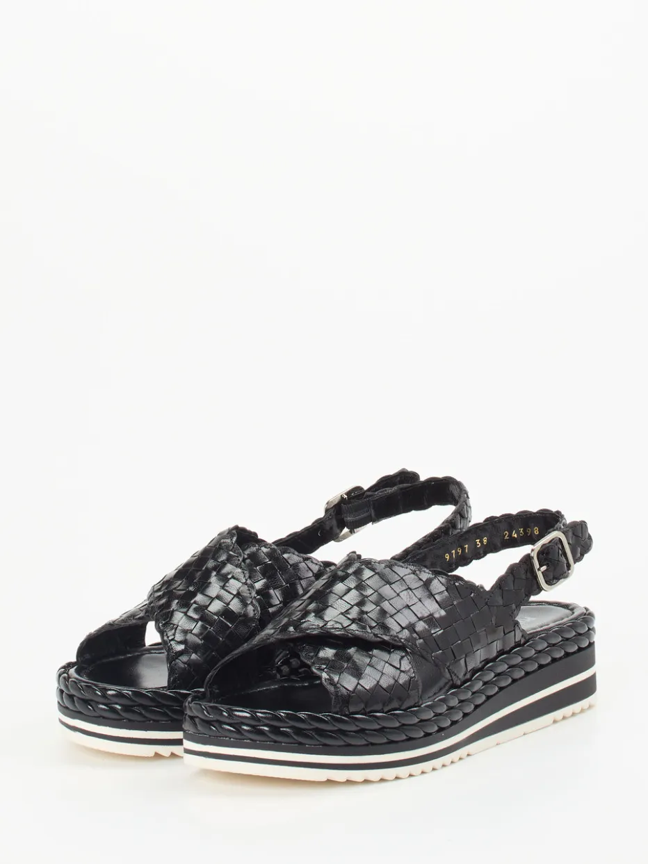 Geflochtenes Leder in edlem Schwarz, kombiniert mit handwerklicher Präzision und einem komfortablen Keilabsatz – ein stilbewusster Begleiter für urbane Sommertage.